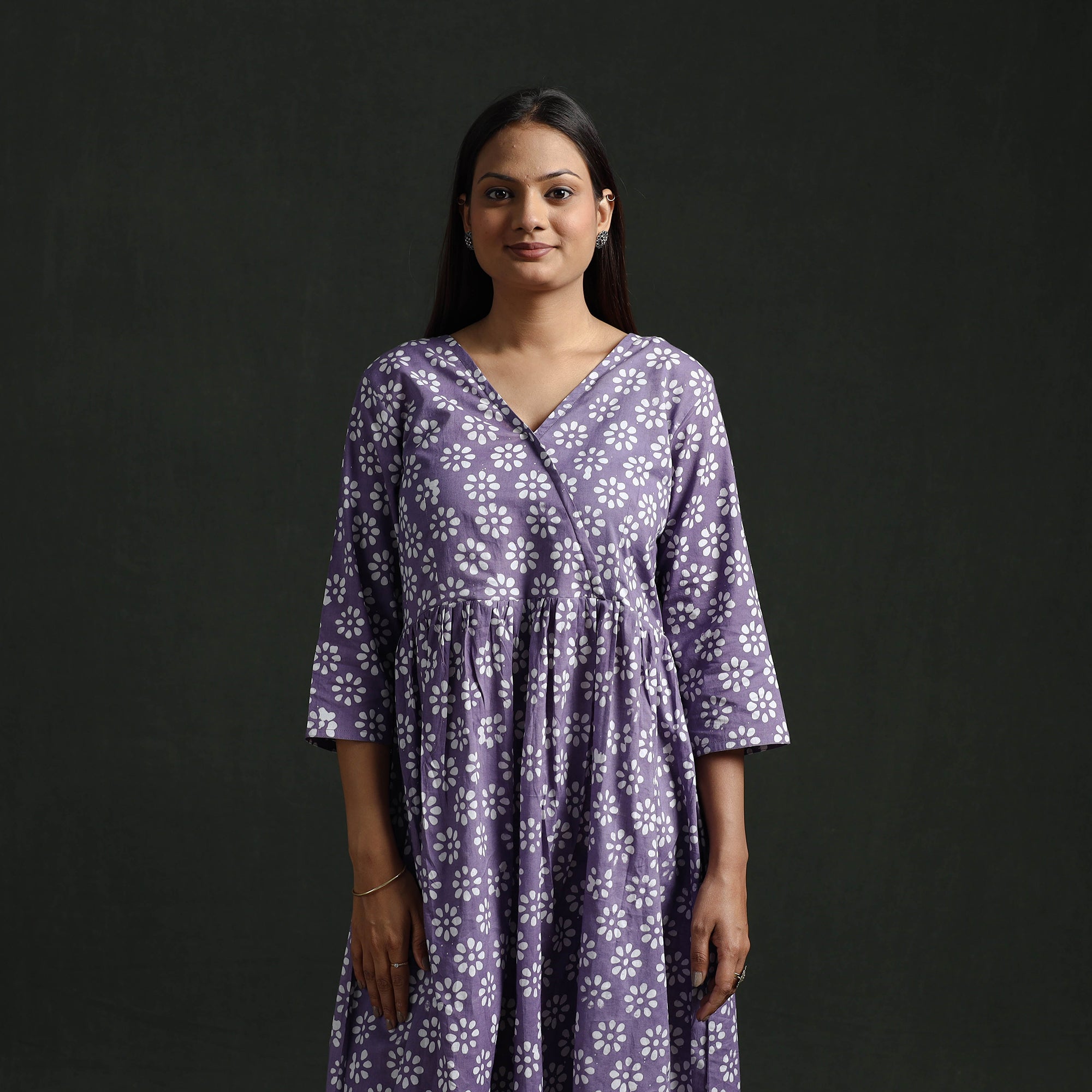 | Material | Flared angrakha dress is designed in a traditional batik block print created using the wax-resist dyeing technique. The batik design is formed through a process that has been practiced in India for centuries. In this method, hot wax is applied in patterns on the fabric before dyeing to shape distinctive motifs. Made from cotton, the dress remains comfortable for extended hours. The flared silhouette adds graceful movement and enhances its overall appeal. It is a practical yet refined option for daily wear, casual outings, or relaxed gatherings. |
