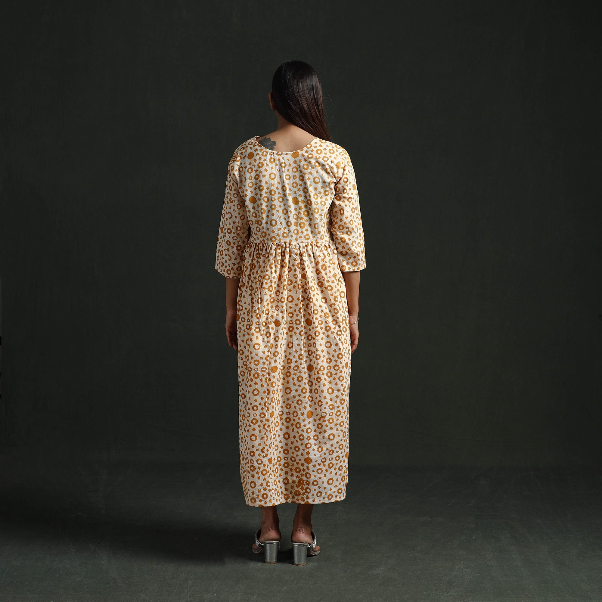 | Material | Flared angrakha dress is designed in a traditional batik block print created using the wax-resist dyeing technique. The batik design is formed through a process that has been practiced in India for centuries. In this method, hot wax is applied in patterns on the fabric before dyeing to shape distinctive motifs. Made from cotton, the dress remains comfortable for extended hours. The flared silhouette adds graceful movement and enhances its overall appeal. It is a practical yet refined option for daily wear, casual outings, or relaxed gatherings. |