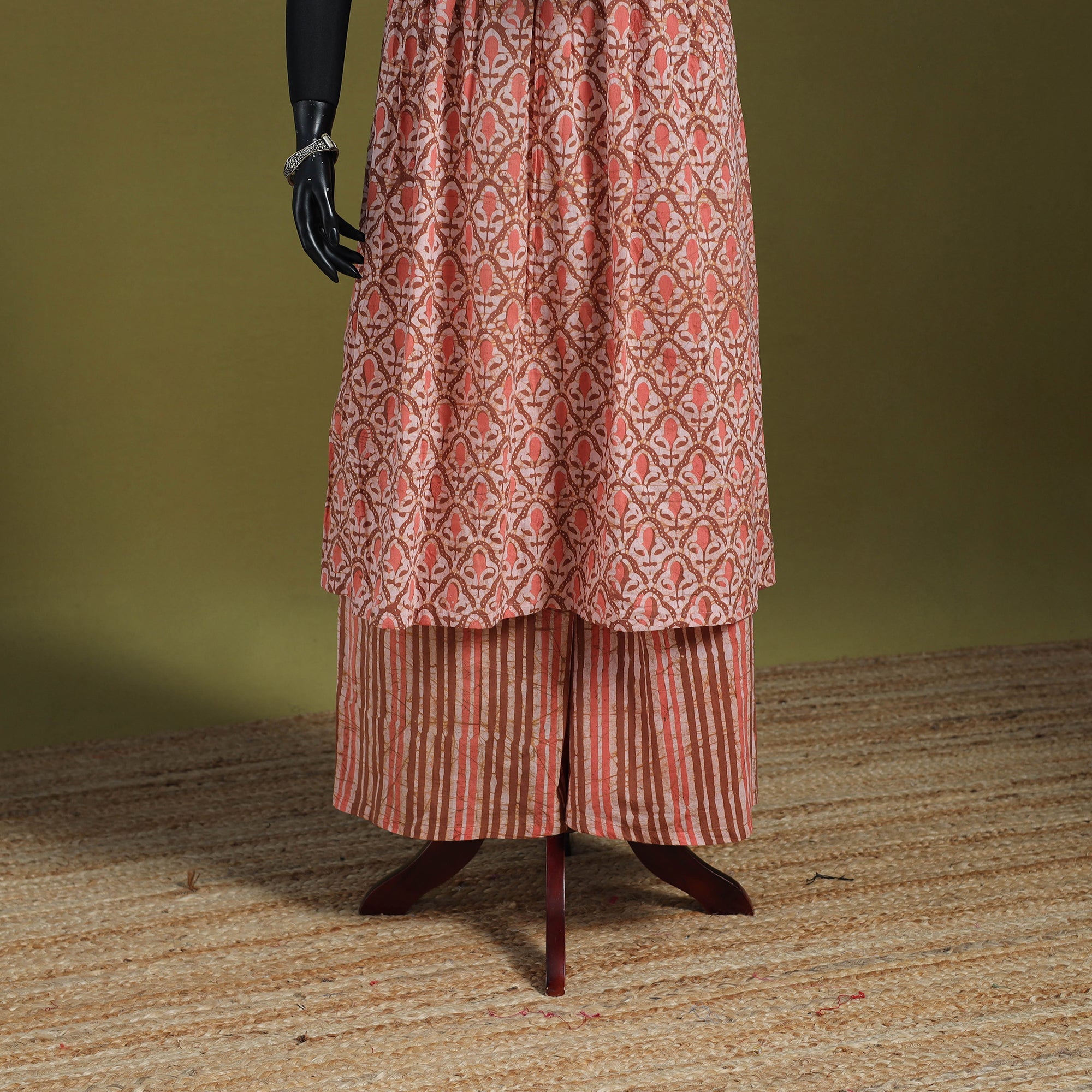 Step into elegance with this peach flared cotton hand batik block print suit set. Crafted using the traditional wax-resist dyeing technique, each pattern showcases a unique artistic charm. The breathable cotton fabric ensures all-day comfort, while the flared kurta and matching palazzo with a flexible waistband offer a graceful fit. Designed to make every moment feel a little more special and stylish, this outfit beautifully blends cultural heritage with modern sophistication.
