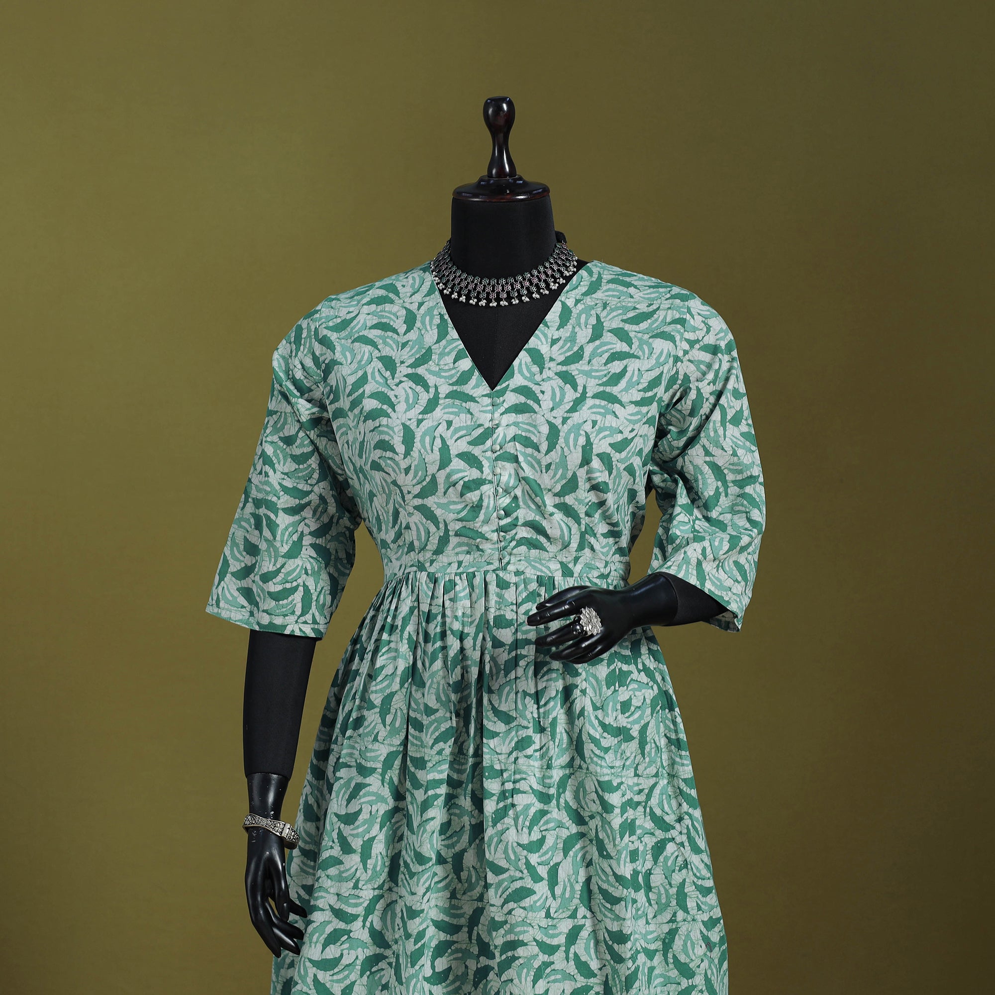 Step into elegance with this green flared cotton hand batik block print suit set. Crafted using the traditional wax-resist dyeing technique, each pattern showcases a unique artistic charm. The breathable cotton fabric ensures all-day comfort, while the flared kurta and matching palazzo with a flexible waistband offer a graceful fit. Designed to make every moment feel a little more special and stylish, this outfit beautifully blends cultural heritage with modern sophistication.