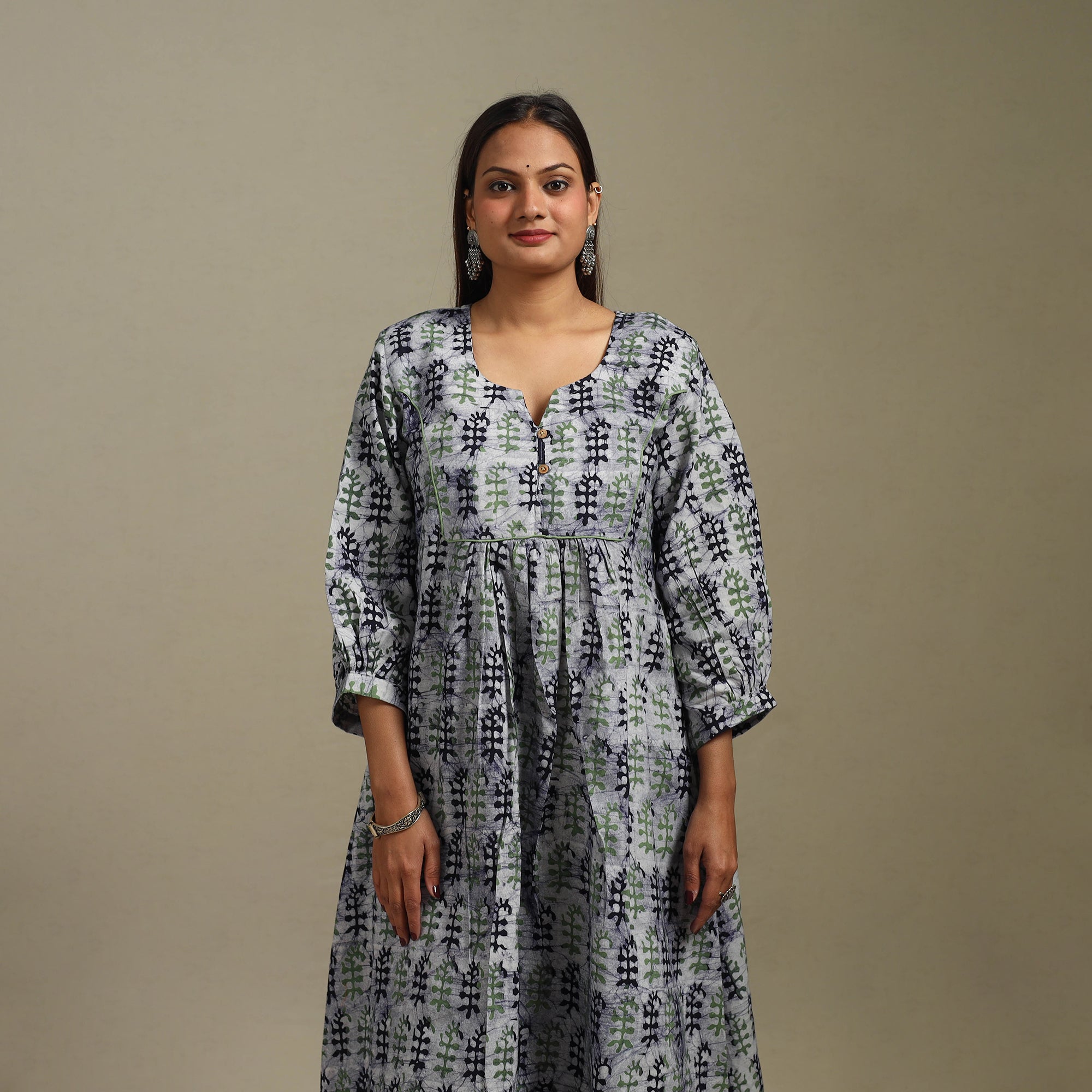 Hand batik print flared kurta is a perfect mix of tradition and comfort. Created using an age-old wax-resist dyeing process, it features intricate, hand-applied batik block patterns. The breathable cotton fabric keeps you relaxed all day. With a comfortable fit and a side pocket, it’s great for casual outings, office or daily wear.