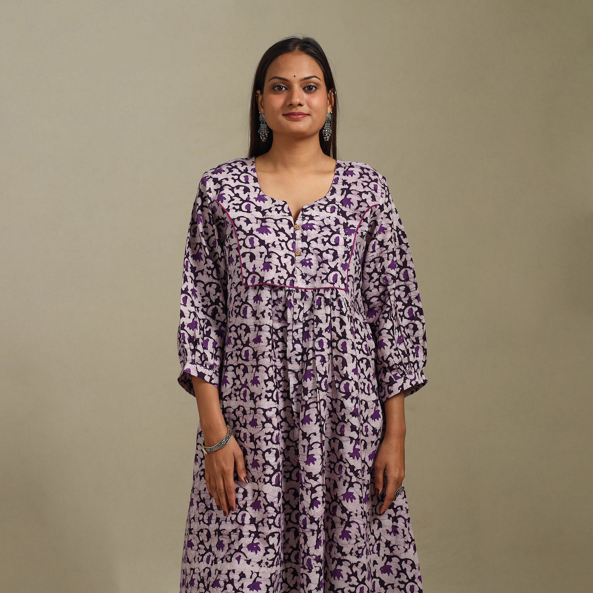 Hand batik print flared kurta is a perfect mix of tradition and comfort. Created using an age-old wax-resist dyeing process, it features intricate, hand-applied batik block patterns. The breathable cotton fabric keeps you relaxed all day. With a comfortable fit and a side pocket, it’s great for casual outings, office or daily wear.