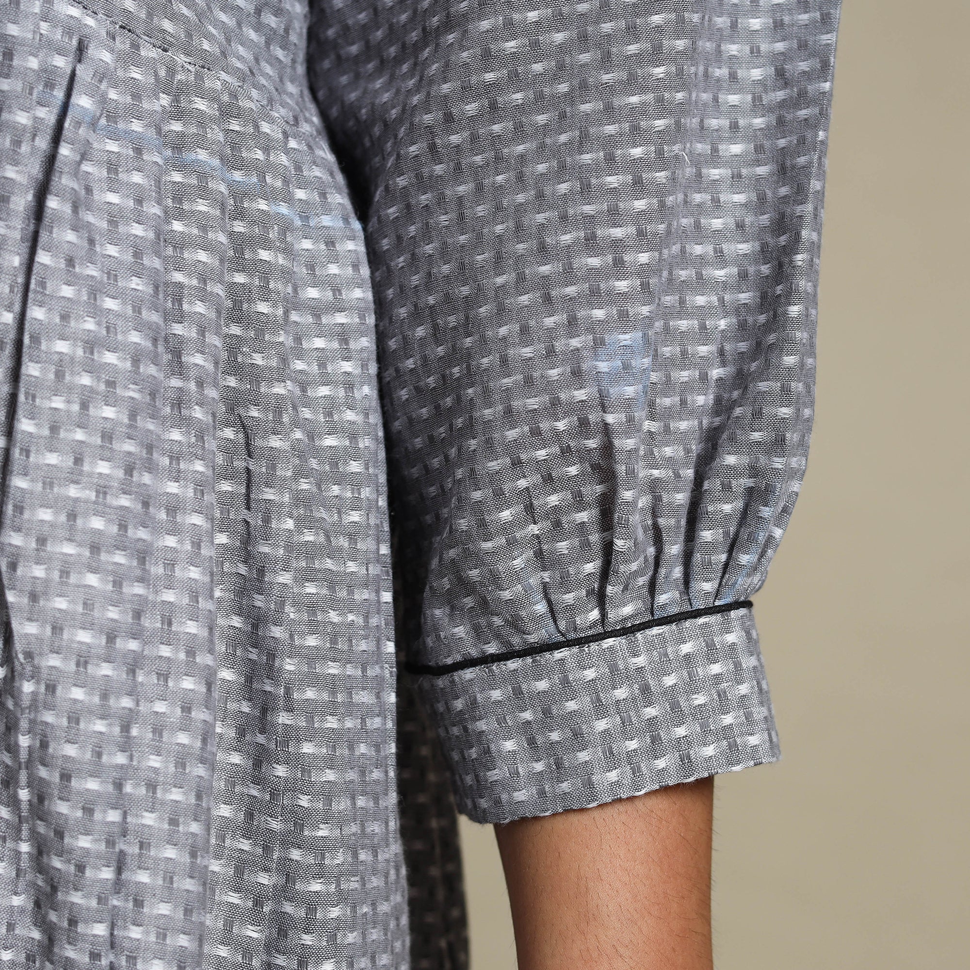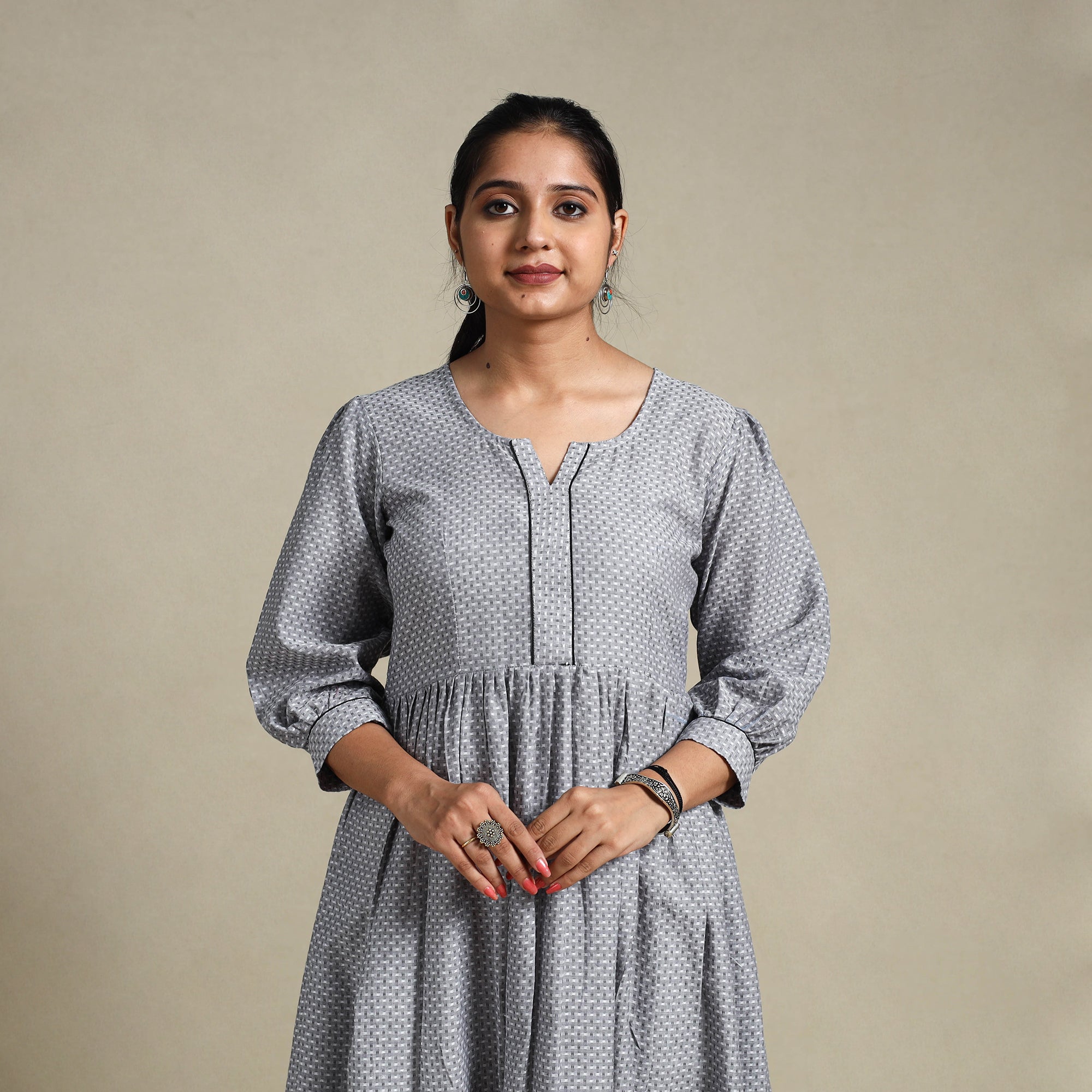 This grey cotton jacquard dress blends traditional weaving with modern elegance. Crafted by skilled artisans, it showcases the beauty of jacquard, a weaving technique known for its intricate patterns. The breathable cotton fabric ensures all-day comfort, while the graceful flared design adds charm and ease to your look. Ideal for casual outings, office wear, or relaxed gatherings.