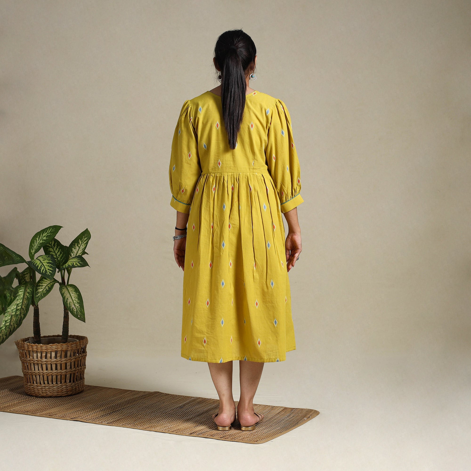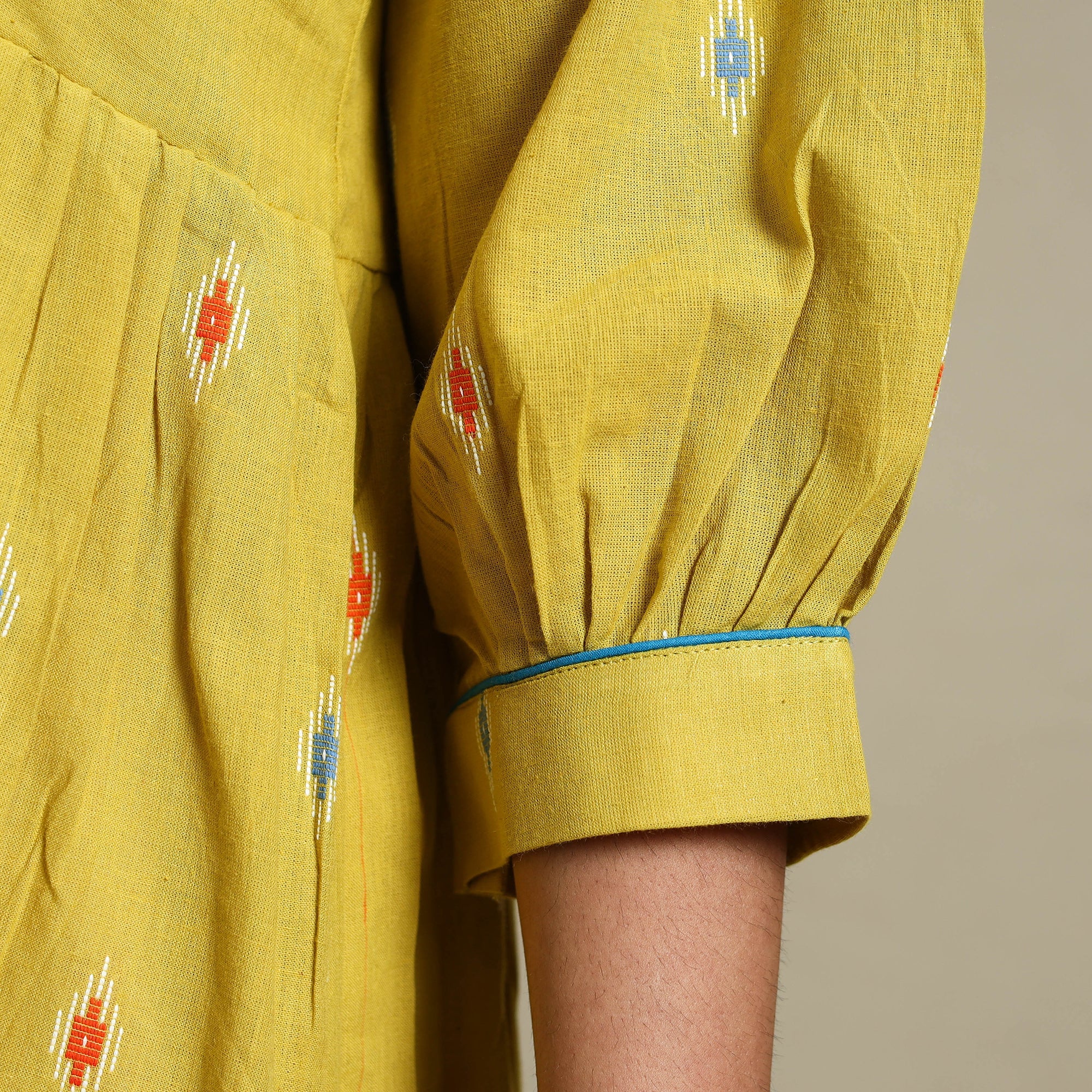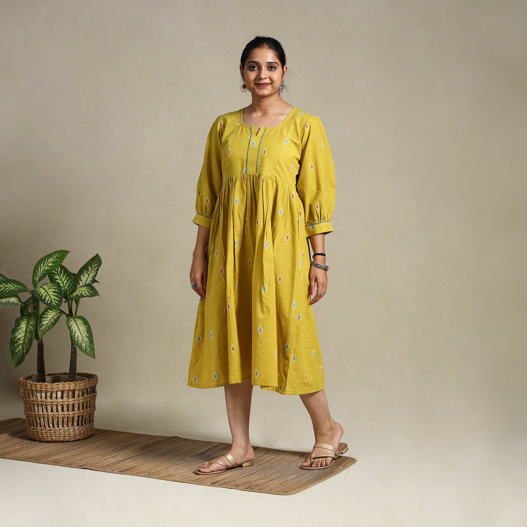 This yellow cotton jacquard dress blends traditional weaving with modern elegance. Crafted by skilled artisans, it showcases the beauty of jacquard, a weaving technique known for its intricate patterns. The breathable cotton fabric ensures all-day comfort, while the graceful flared design adds charm and ease to your look. Ideal for casual outings, office wear, or relaxed gatherings.