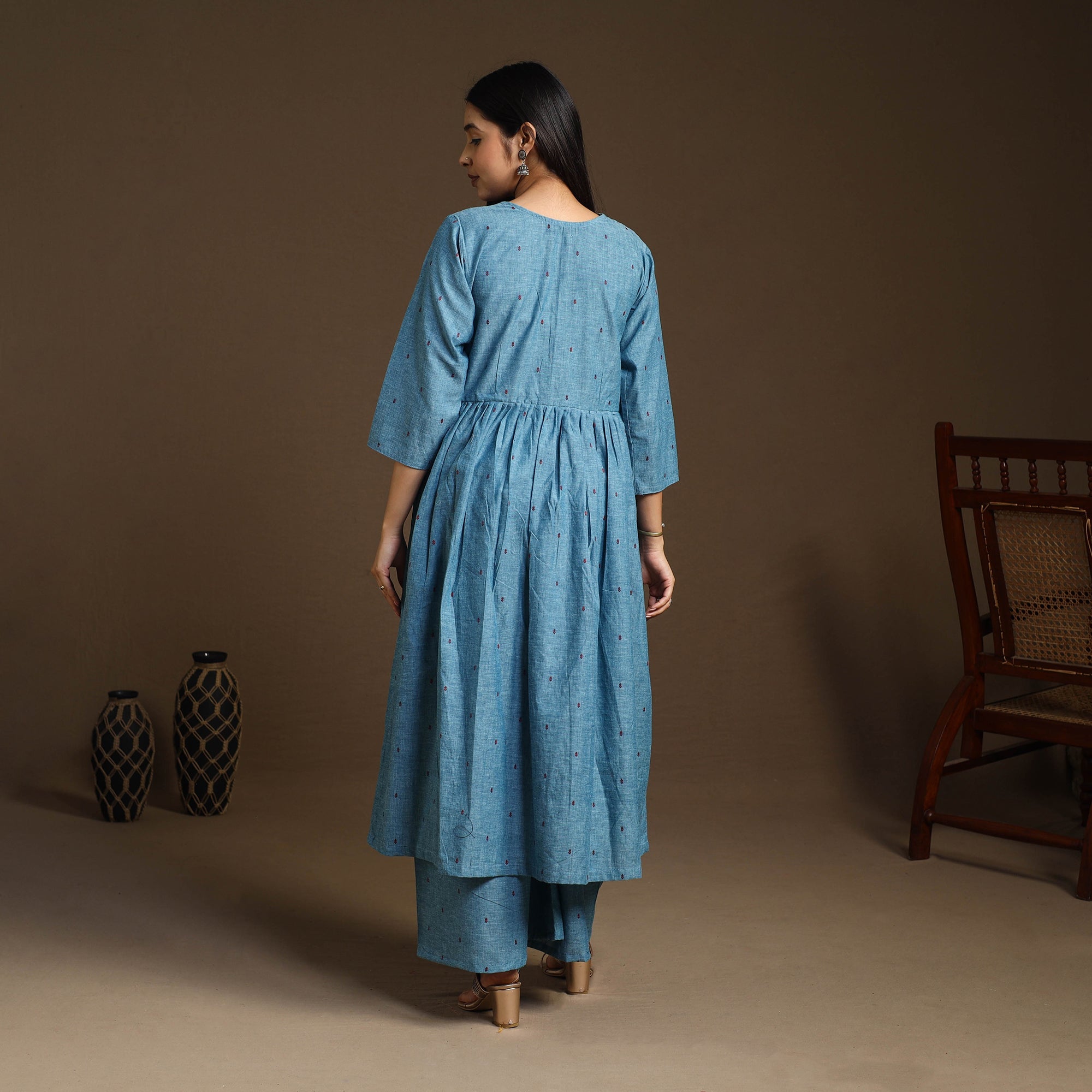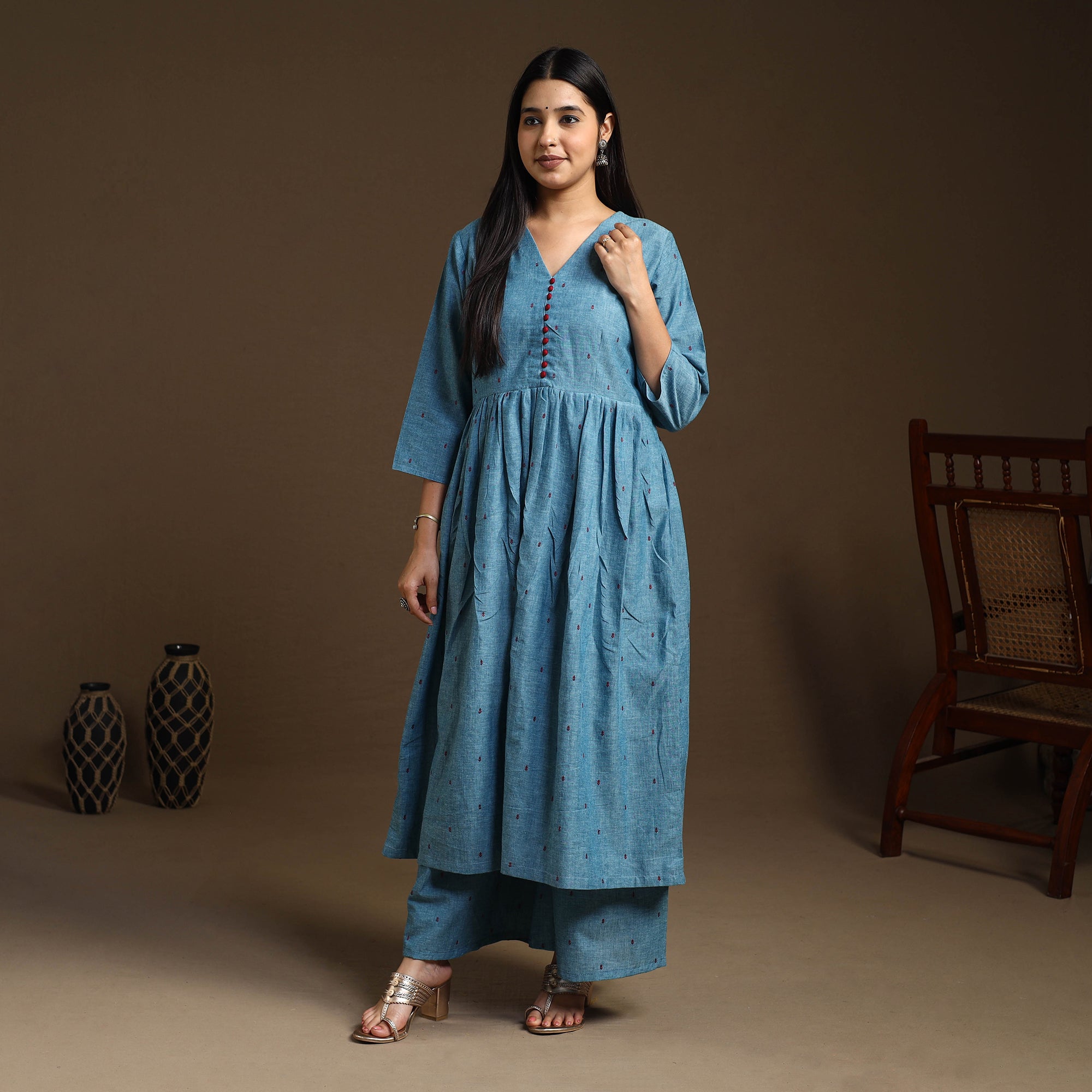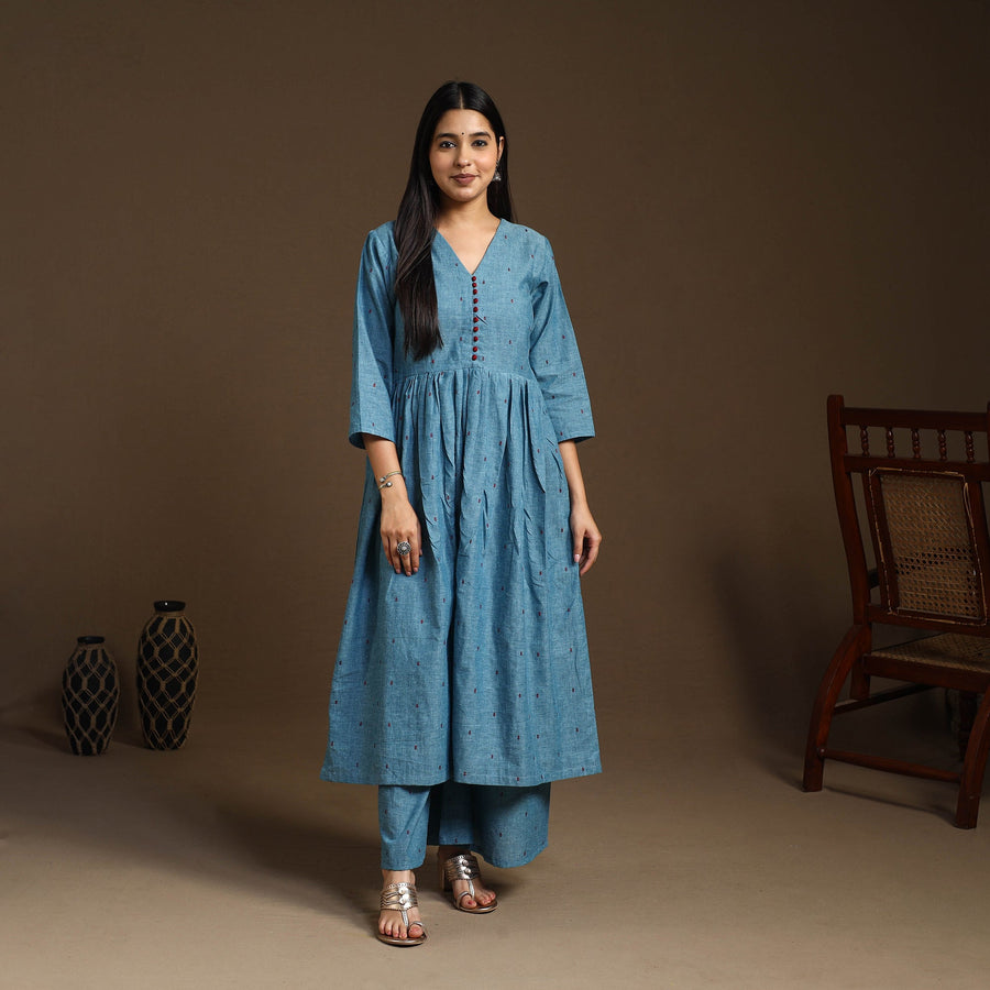 This cotton blue jacquard kurta set beautifully combines traditional elegance with modern comfort. Featuring intricate woven patterns and a graceful flared, the kurta comes with a comfortable elasticated palazzo. Perfect for festive celebrations or casual outings, this ensemble ensures effortless style and all-day ease.