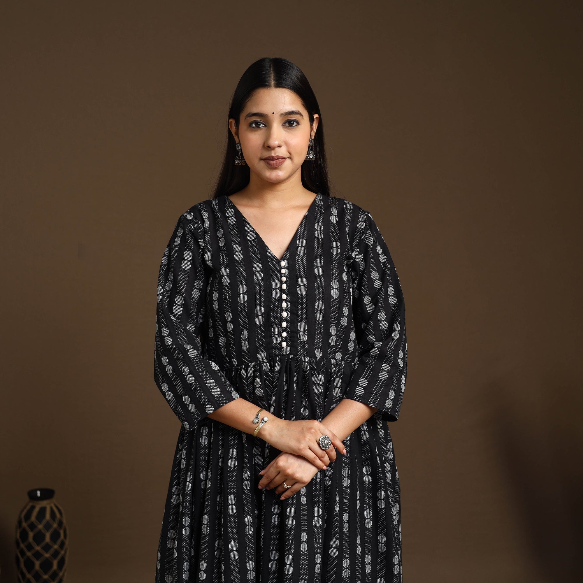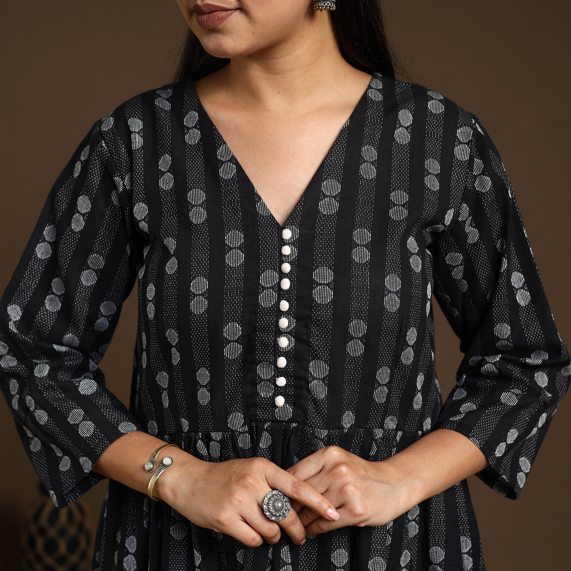 This cotton black jacquard kurta set beautifully combines traditional elegance with modern comfort. Featuring intricate woven patterns and a graceful flared, the kurta comes with a comfortable elasticated palazzo. Perfect for festive celebrations or casual outings, this ensemble ensures effortless style and all-day ease.