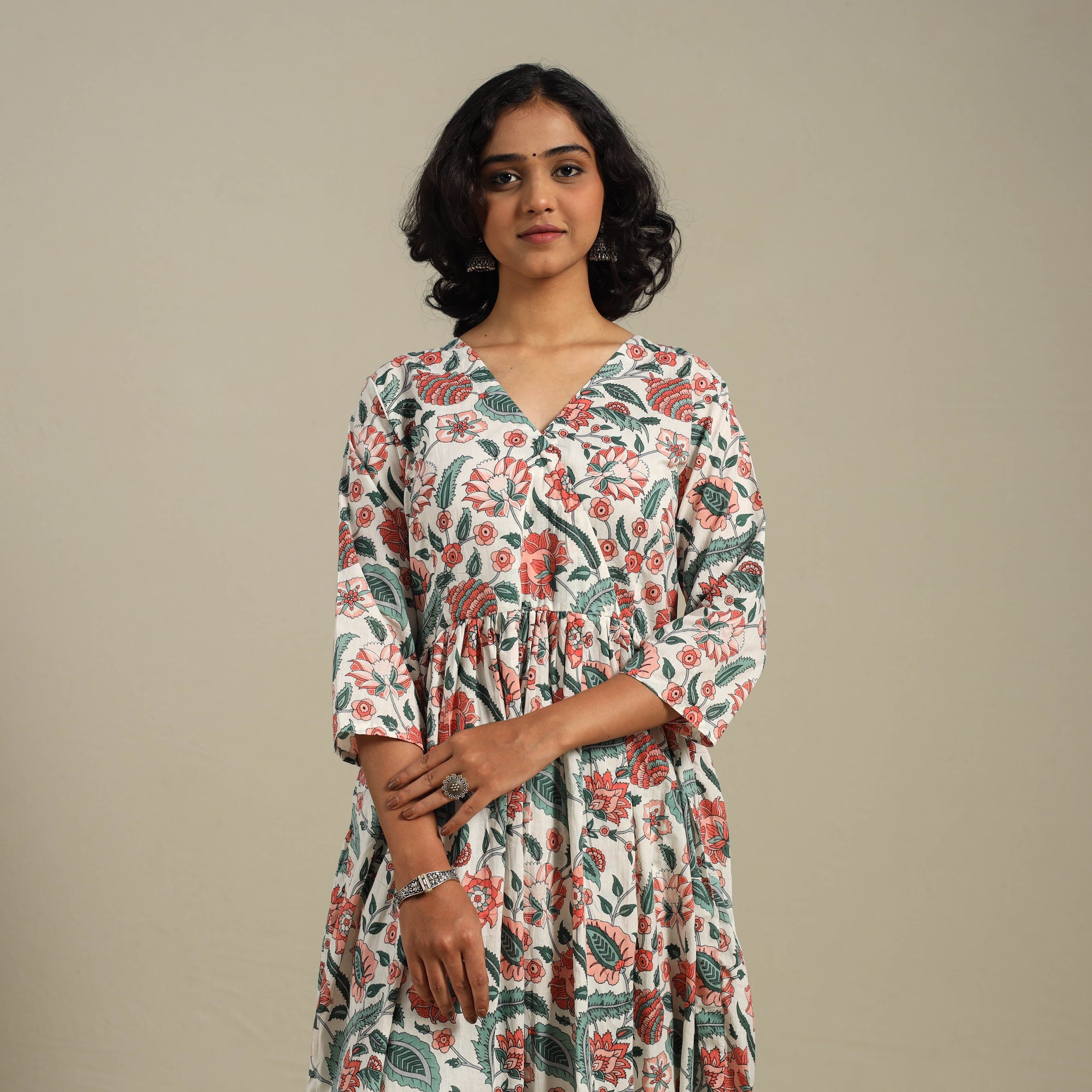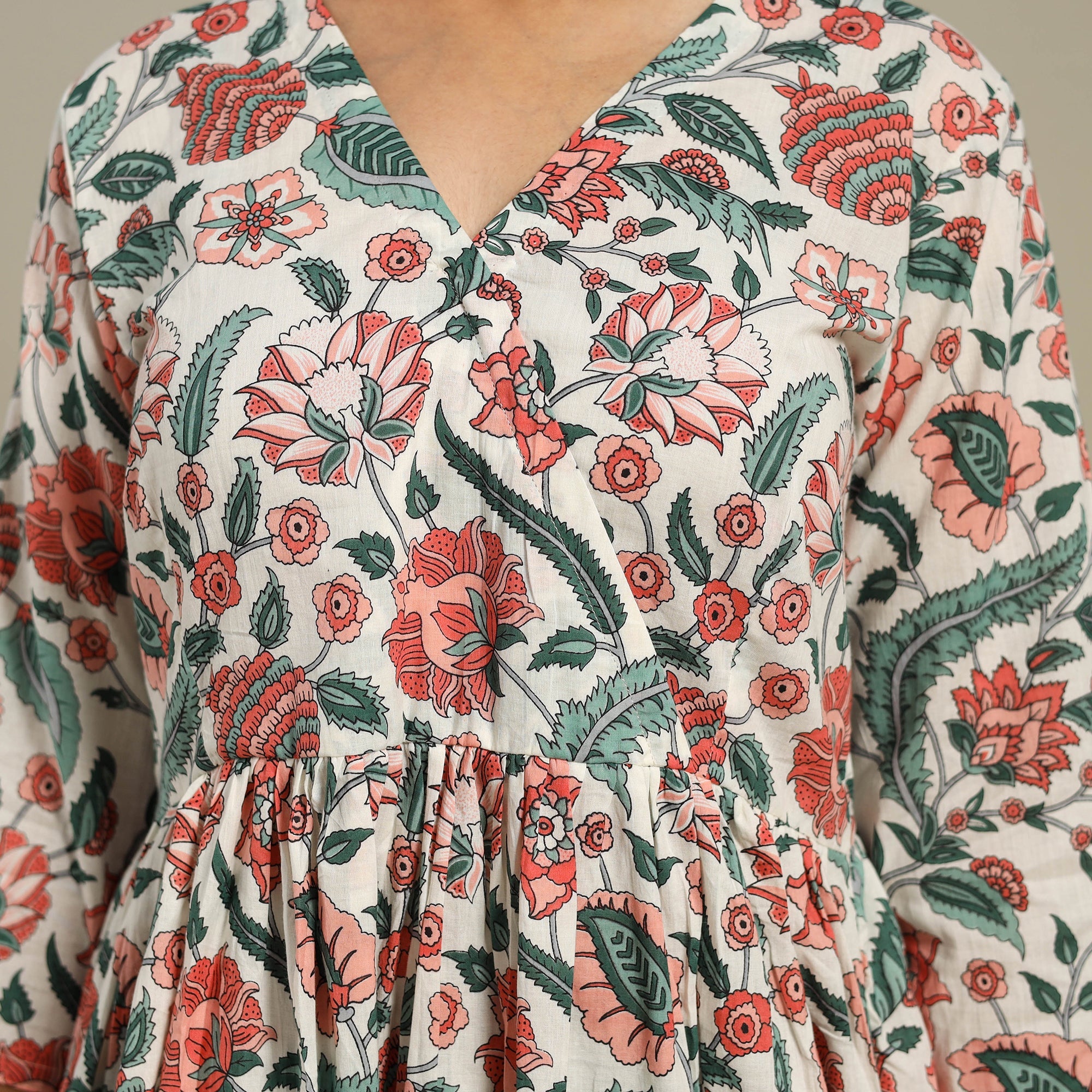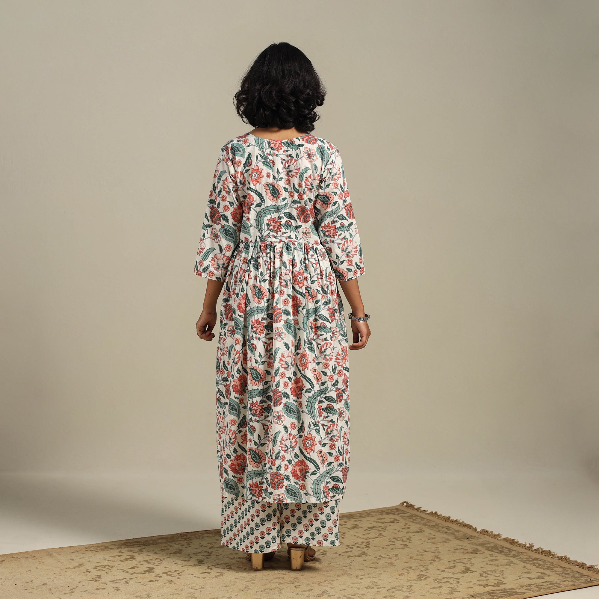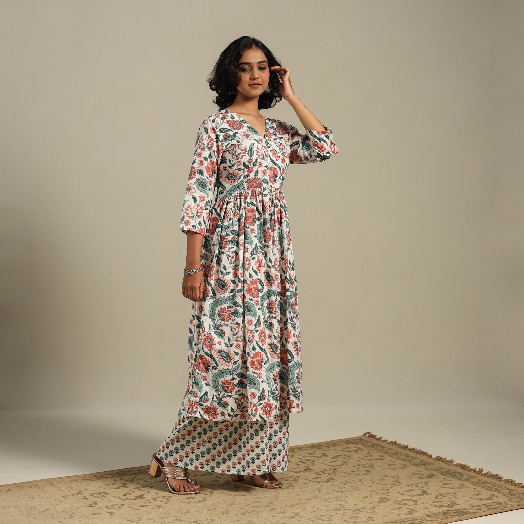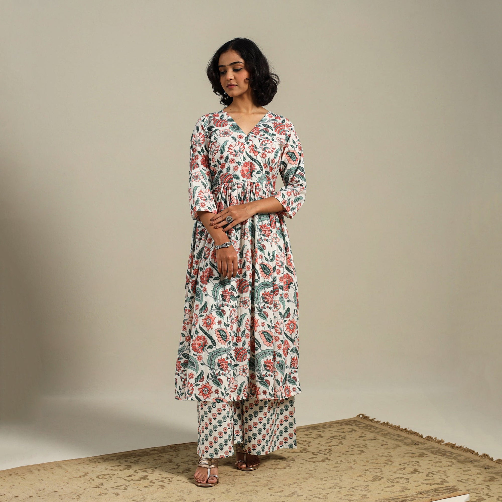 This white jaipur print kurta set is crafted from breathable cotton and features a flared kurta adorned with delicate floral motifs. It is paired with comfortable palazzos that have an elasticated waist and two practical side pockets. The lightweight fabric, relaxed fit, and elegant prints make it perfect for both daily comfort and festive styling.