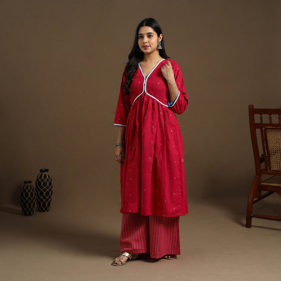 Designed for effortless elegance, this red jacquard cotton kurta seamlessly blends traditional craftsmanship with modern comfort. Featuring a graceful flared silhouette, it is adorned with delicate lacework, adding a touch of subtle charm. The soft jacquard fabric ensures a comfortable fit, making it ideal for both casual outings and festive occasions. This piece carries tiny knots, thread pulls, or uneven lines — not flaws, but fingerprints. Every irregularity is a whisper from the hands that made it. It’s what happens when tradition weaves through time, not machines. If you’re looking for perfection, this isn’t it. But if you’re looking for soul — you’ve found it.