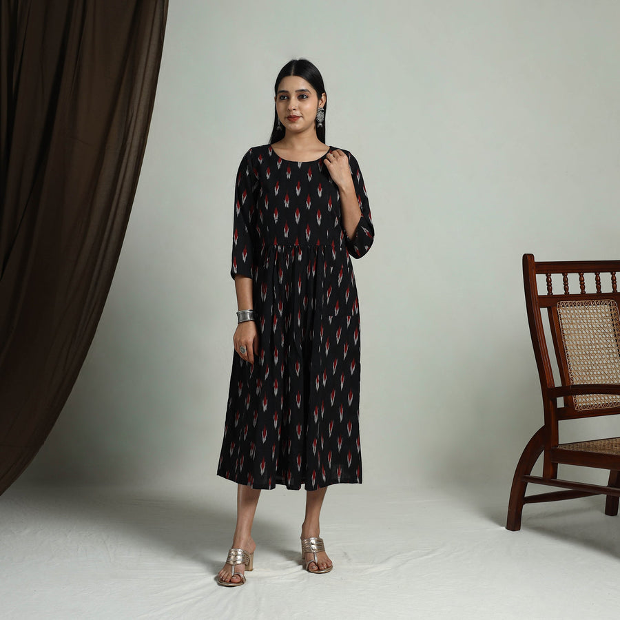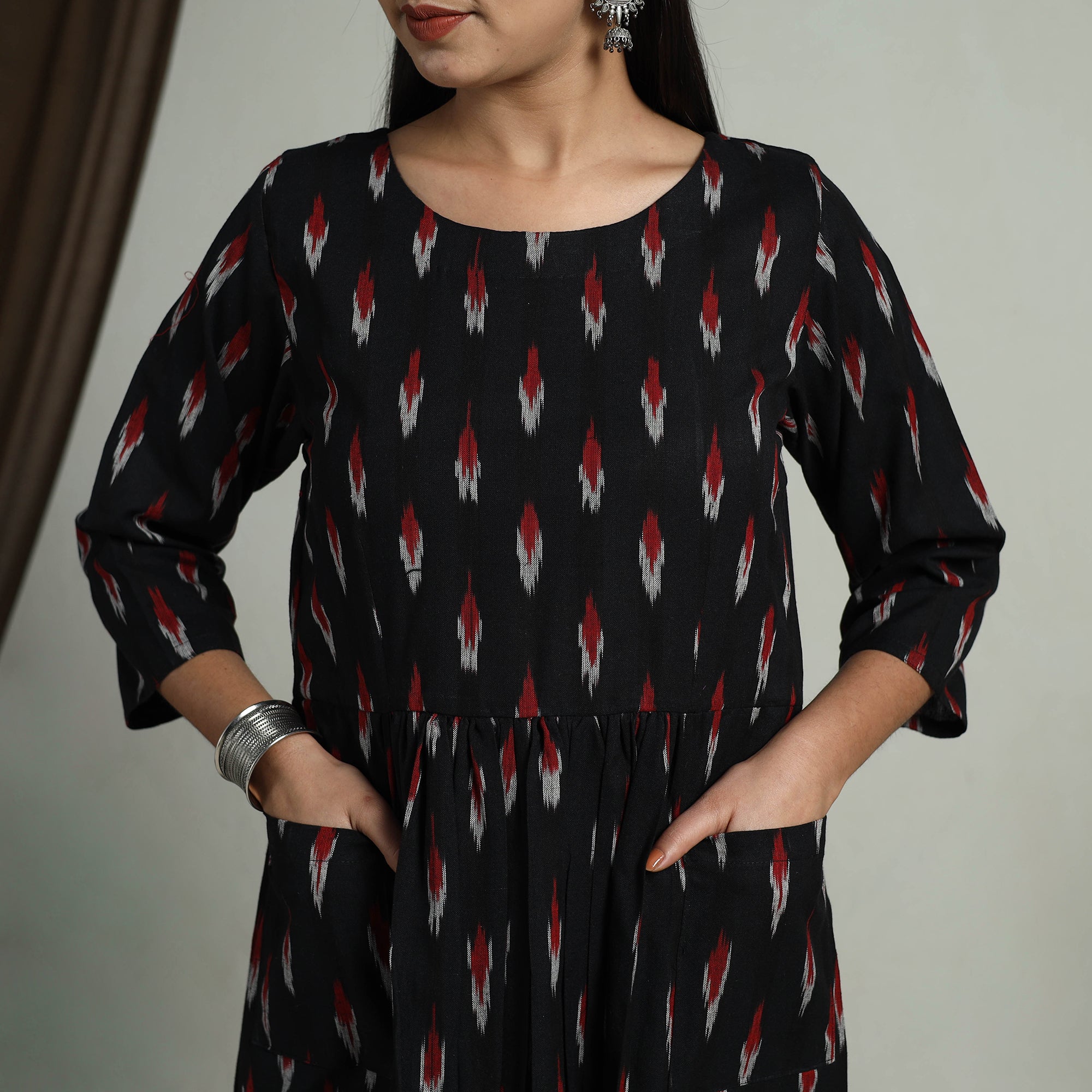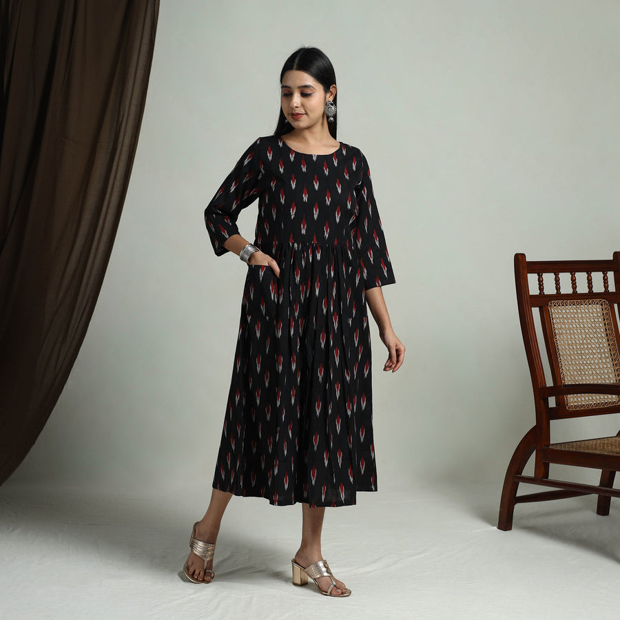This uniquely designed flared cotton black pochampally ikat dress is a perfect blend of style and comfort. Featuring the intricate Ikat dyeing technique, it showcases unique, vibrant patterns. Designed for both daily outings and special occasions, this dress also includes two front pockets, adding a touch of convenience and functionality to your stylish look.