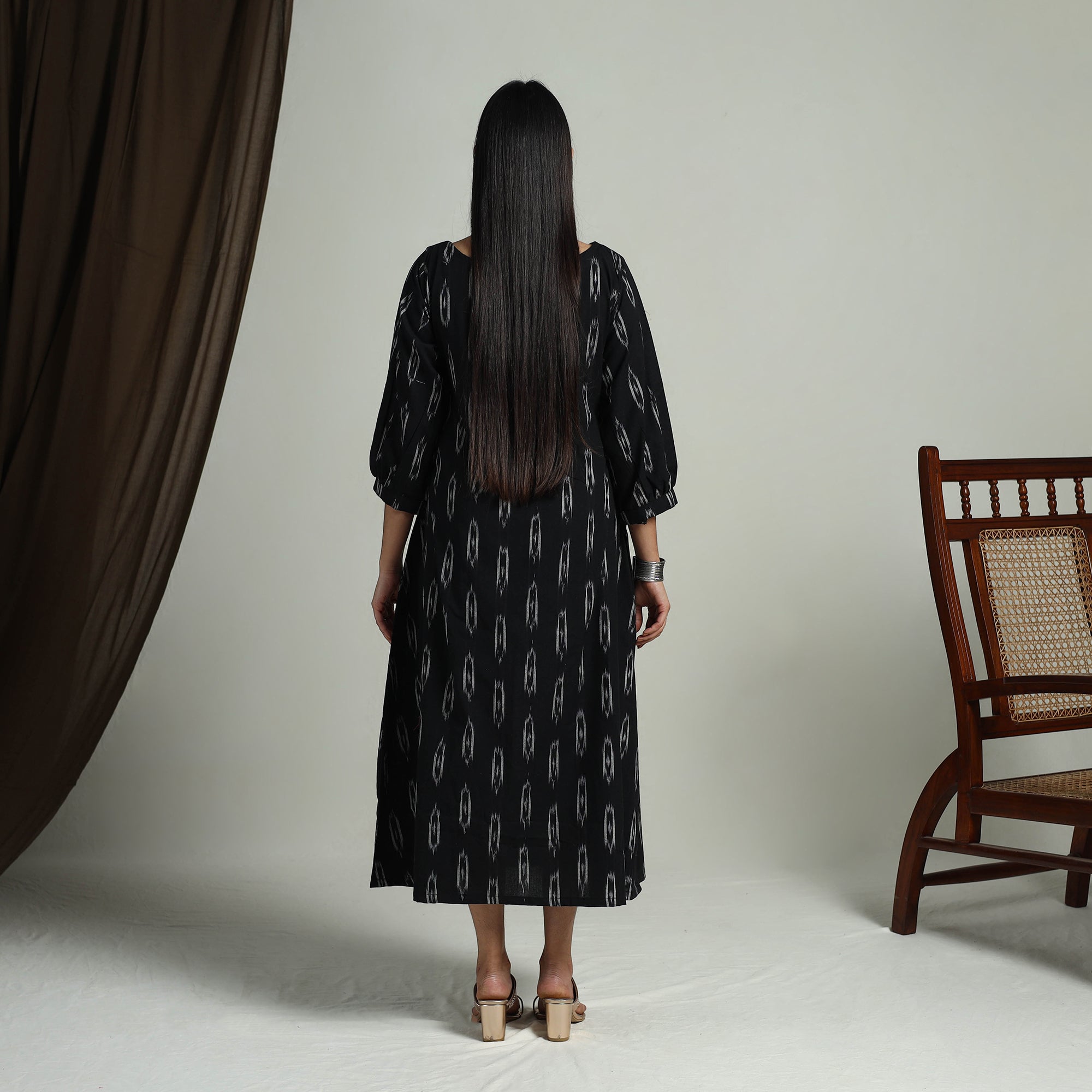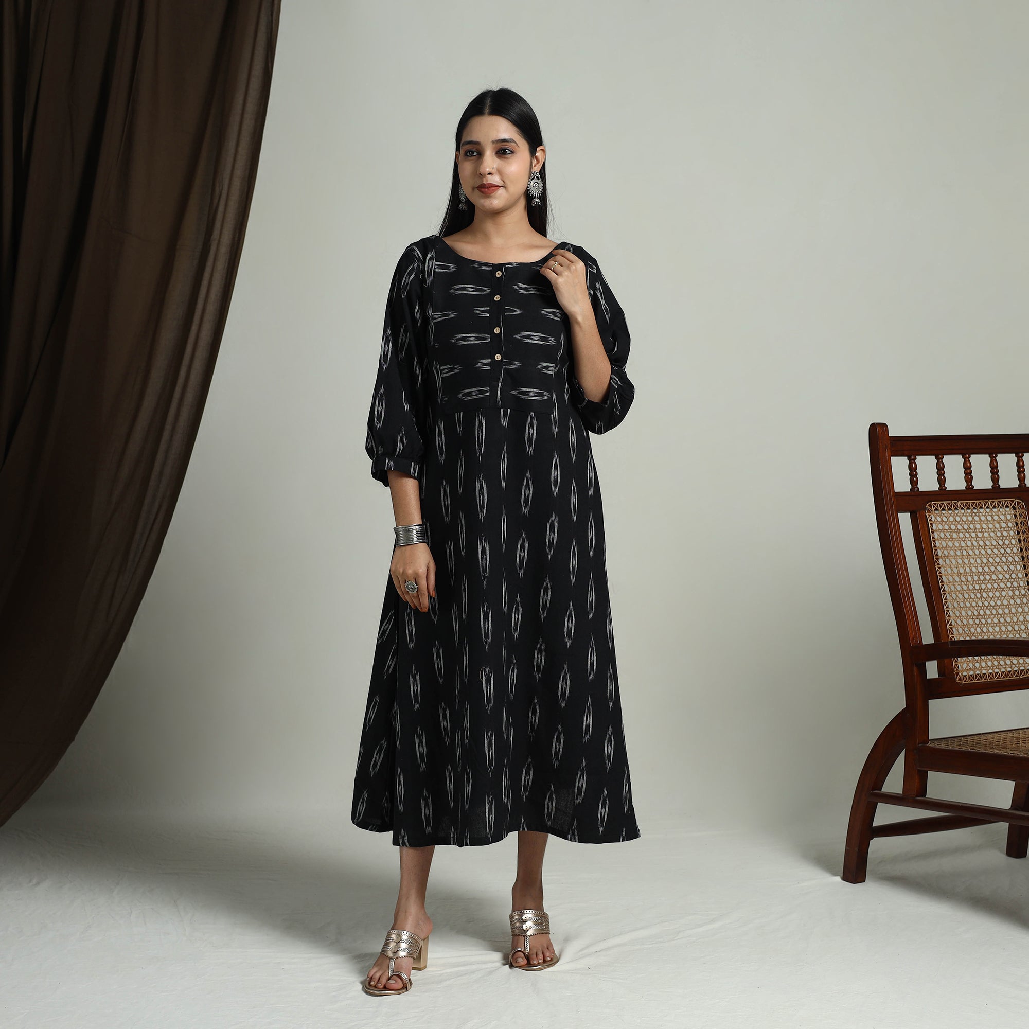 This uniquely designed flared cotton black pochampally ikat dress is a perfect blend of style and comfort. Featuring the intricate Ikat dyeing technique, it showcases unique, vibrant patterns. Designed for both daily outings and special occasions, this dress also includes a side pocket, adding a touch of convenience and functionality to your stylish look.