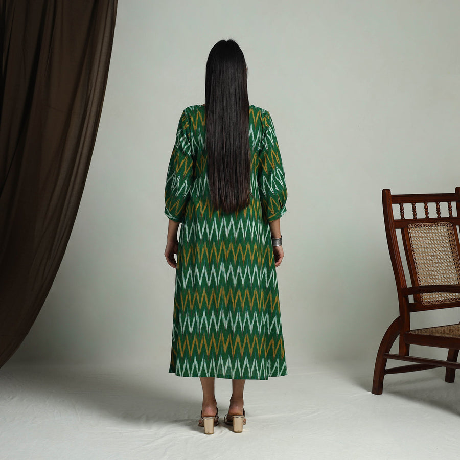 This uniquely designed flared cotton green pochampally ikat dress is a perfect blend of style and comfort. Featuring the intricate Ikat dyeing technique, it showcases unique, vibrant patterns. Designed for both daily outings and special occasions, this dress also includes a side pocket, adding a touch of convenience and functionality to your stylish look.