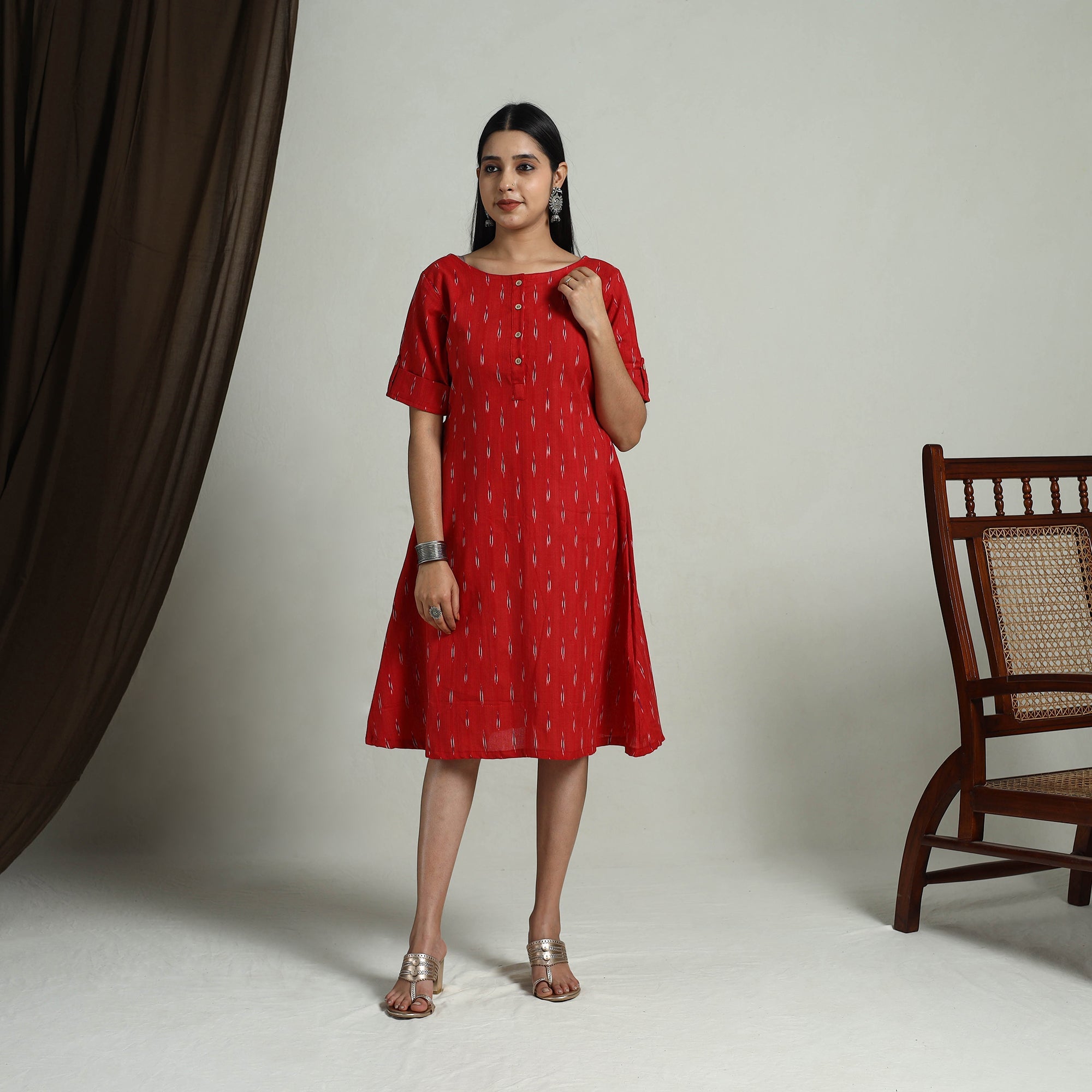 This uniquely designed red flared cotton short pochampally ikat dress is a perfect blend of style and comfort. Featuring the intricate Ikat dyeing technique, it showcases unique, vibrant patterns. Designed for both daily outings and special occasions, this dress also includes a side pocket, adding a touch of convenience and functionality to your stylish look.