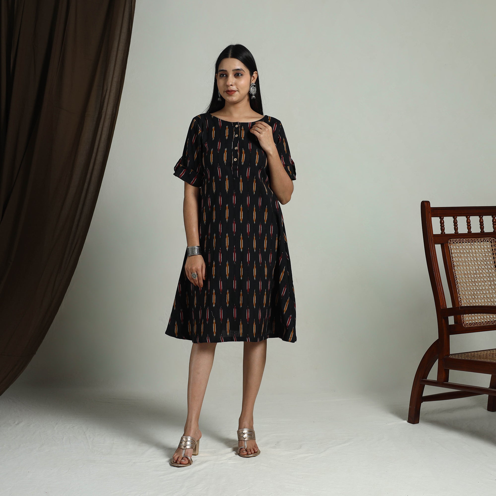 This uniquely designed black flared cotton short pochampally ikat dress is a perfect blend of style and comfort. Featuring the intricate Ikat dyeing technique, it showcases unique, vibrant patterns. Designed for both daily outings and special occasions, this dress also includes a side pocket, adding a touch of convenience and functionality to your stylish look.