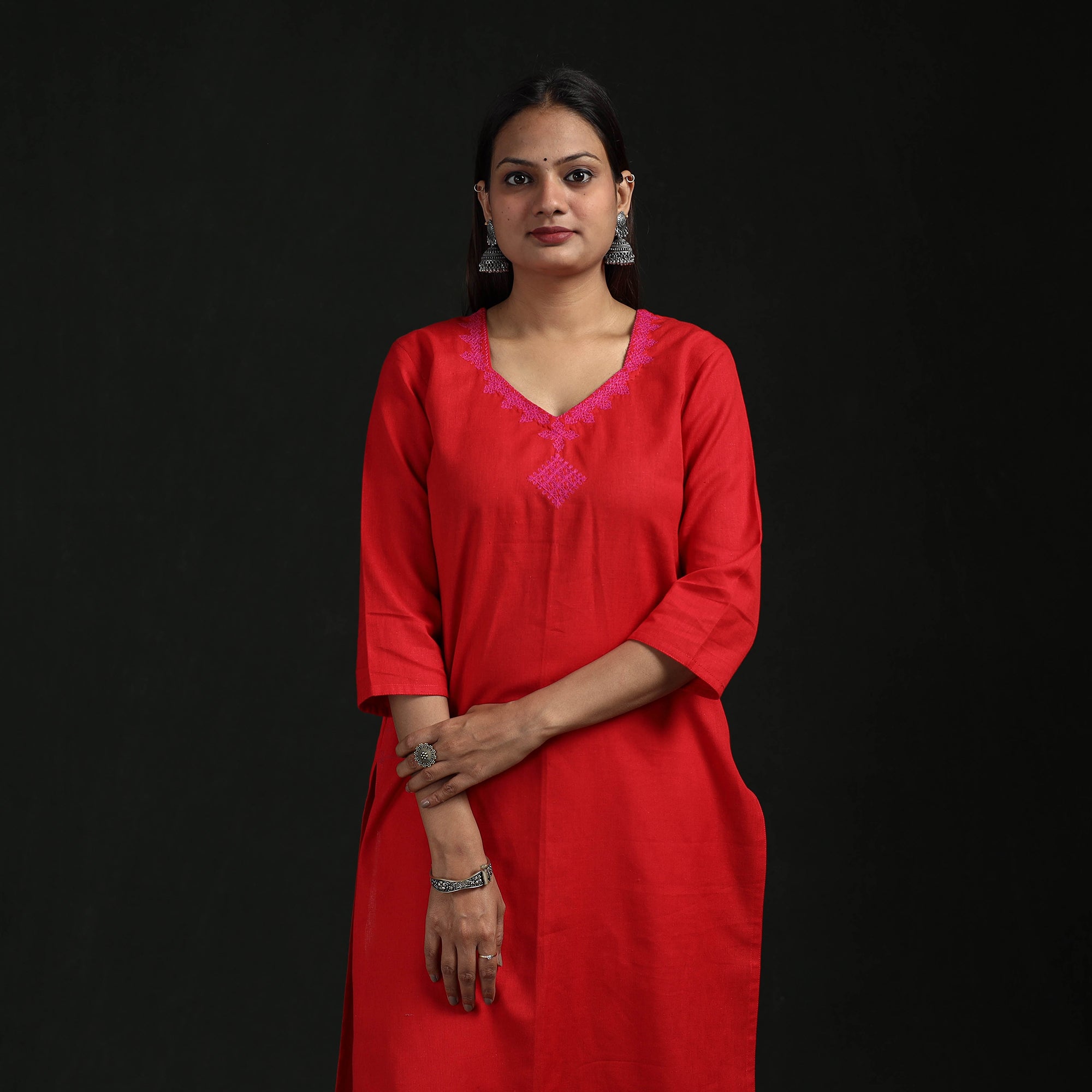 Red - Flex Cotton Plain Hand Embroidered Straight Kurta for women 04
