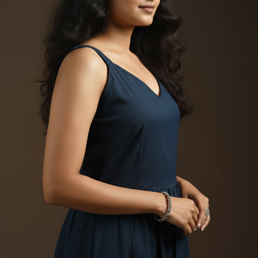 Tiered blue plain dress is simple, soft and comfortable. Made from breathable flex cotton, it feels light and easy on the skin perfect for all-day wear. The sleeveless design adds a relaxed, modern touch, making it suitable for casual outings or daily use. A piece that beautifully combines comfort and effortless elegance for a stylish look.
