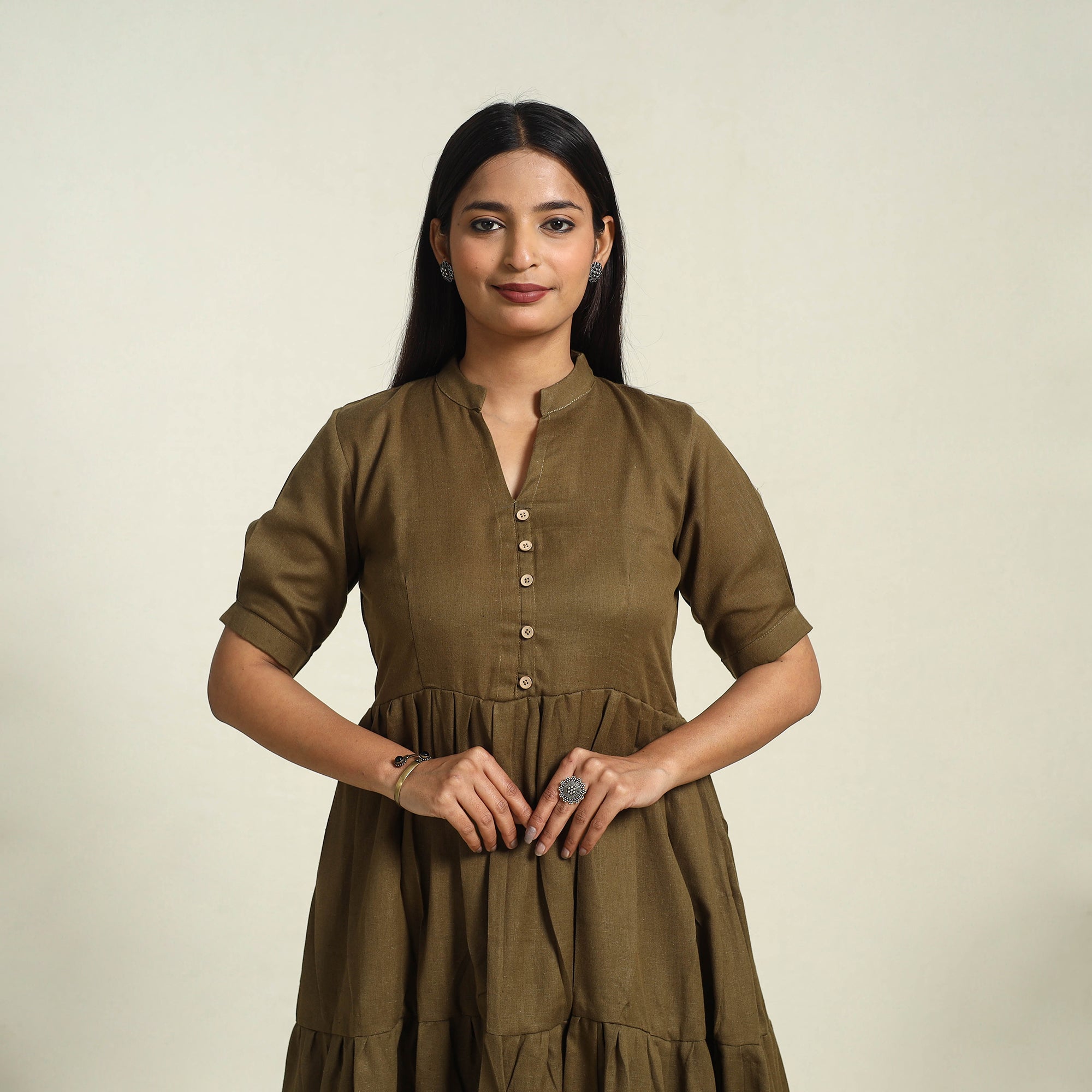 Add effortless elegance to your wardrobe with this tiered brown plain dress, crafted from flex cotton. Designed for a soft, breathable feel, it ensures all-day comfort without compromising on style. Perfect for everyday outings or casual gatherings, this dress beautifully blends traditional charm with modern simplicity.