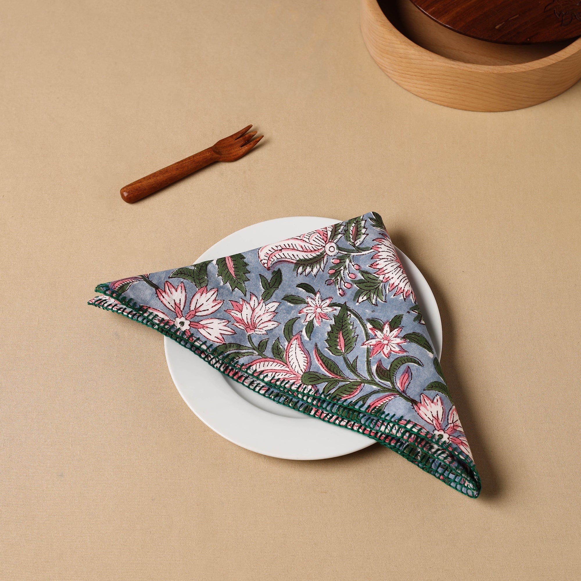 Enhance your dining experience with our grey floral block print cotton hand embroidery napkins, beautifully hand-embroidered by skilled artisans. Perfect for dinners or gatherings. This napkin is soft and pretty.