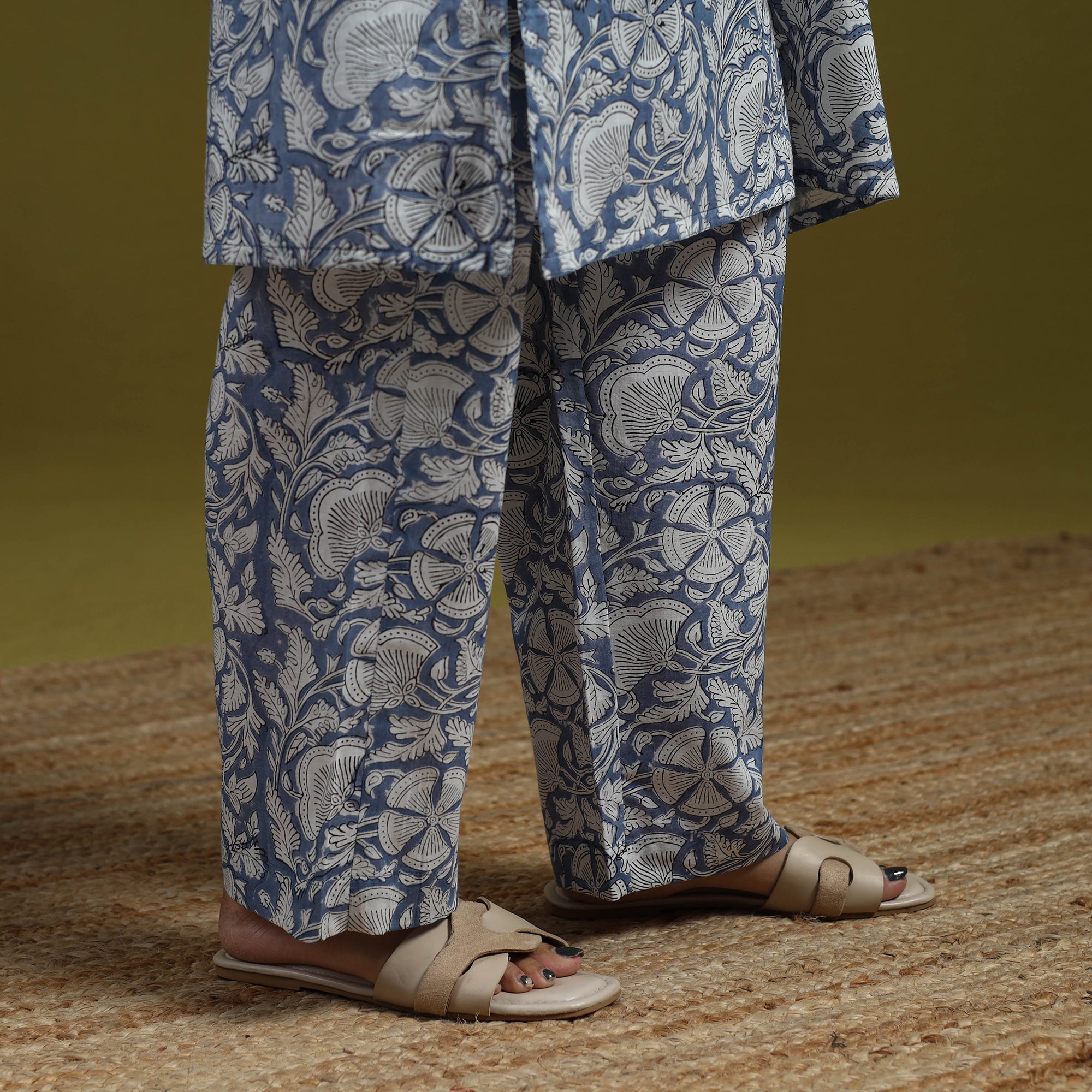 Sanganeri cotton co-ord set, adorned with delicate floral block prints rooted in Rajasthan’s heritage. The set includes a breathable cotton top and palazzos with an elasticized waist for a perfect fit, along with side pockets for added convenience. Whether for work, brunch or a gathering, this block print co-ord set offers effortless elegance.