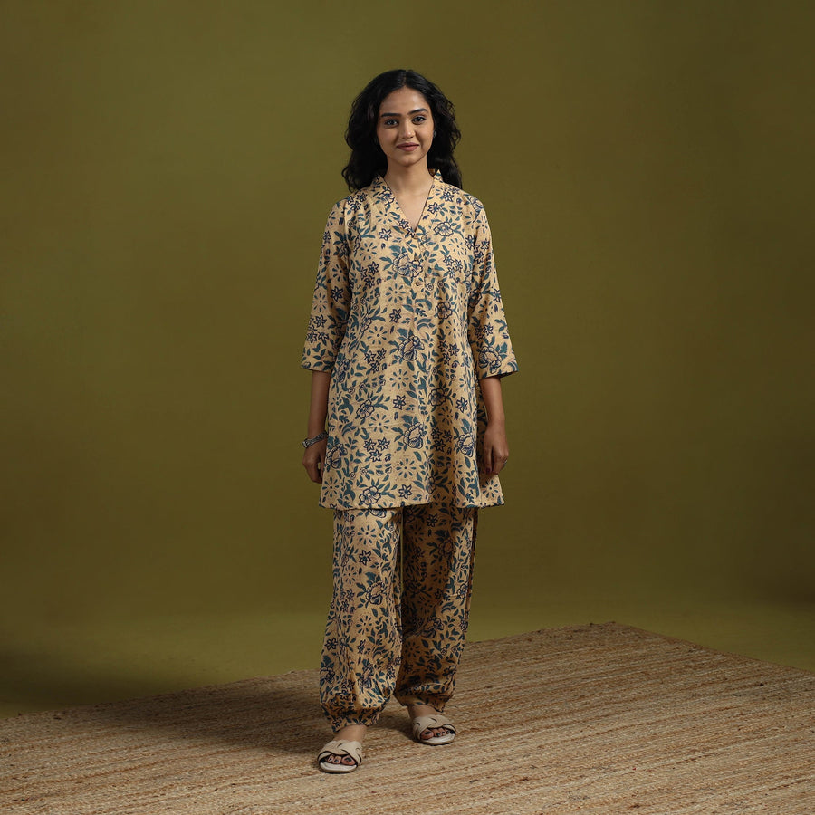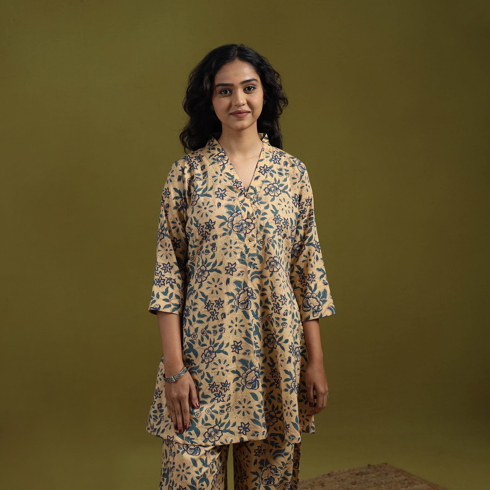 Sanganeri cotton co-ord set features delicate floral block prints inspired by Rajasthan’s rich heritage. The set includes a breathable cotton top paired with an afghani salwar, designed with an elasticated waist and drawstring for an easy, adjustable fit. Ideal for workdays, brunch outings or gatherings, this block print co-ord set brings together comfort and effortless elegance.