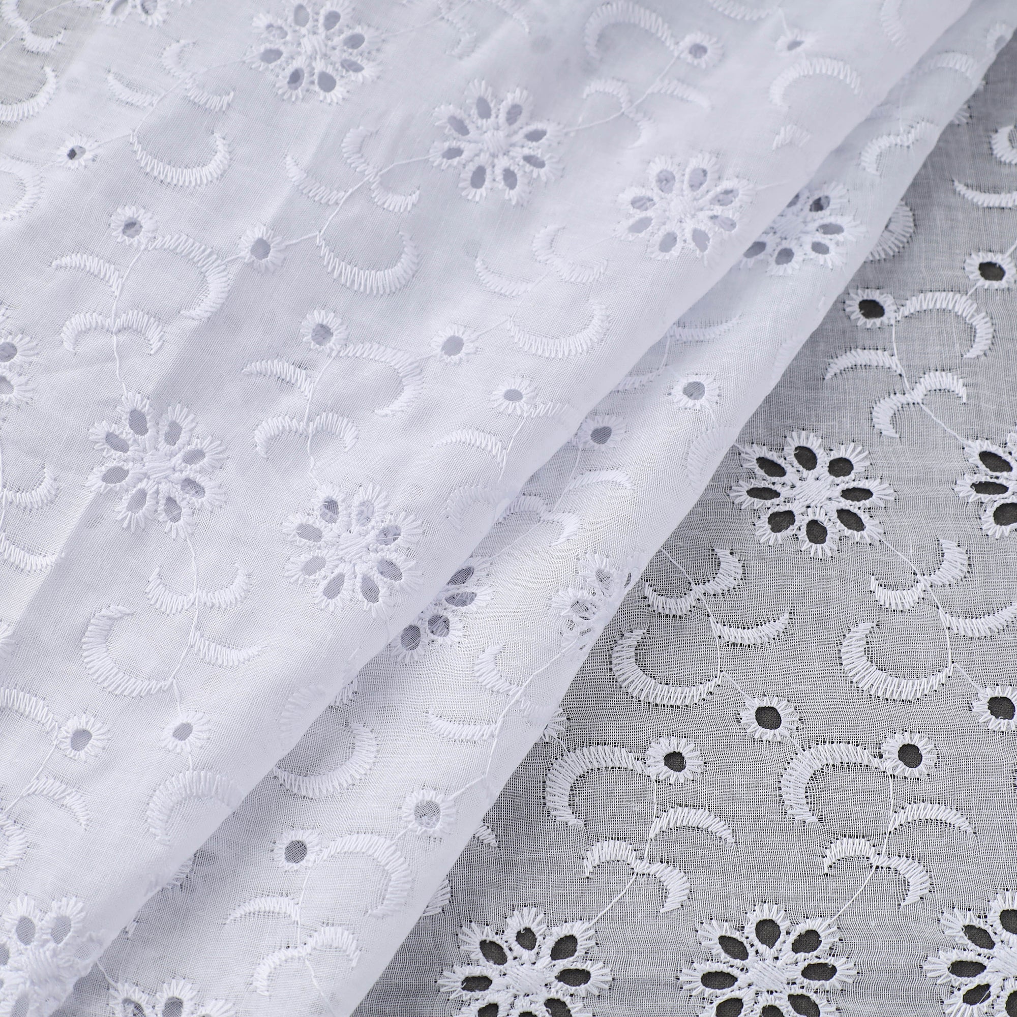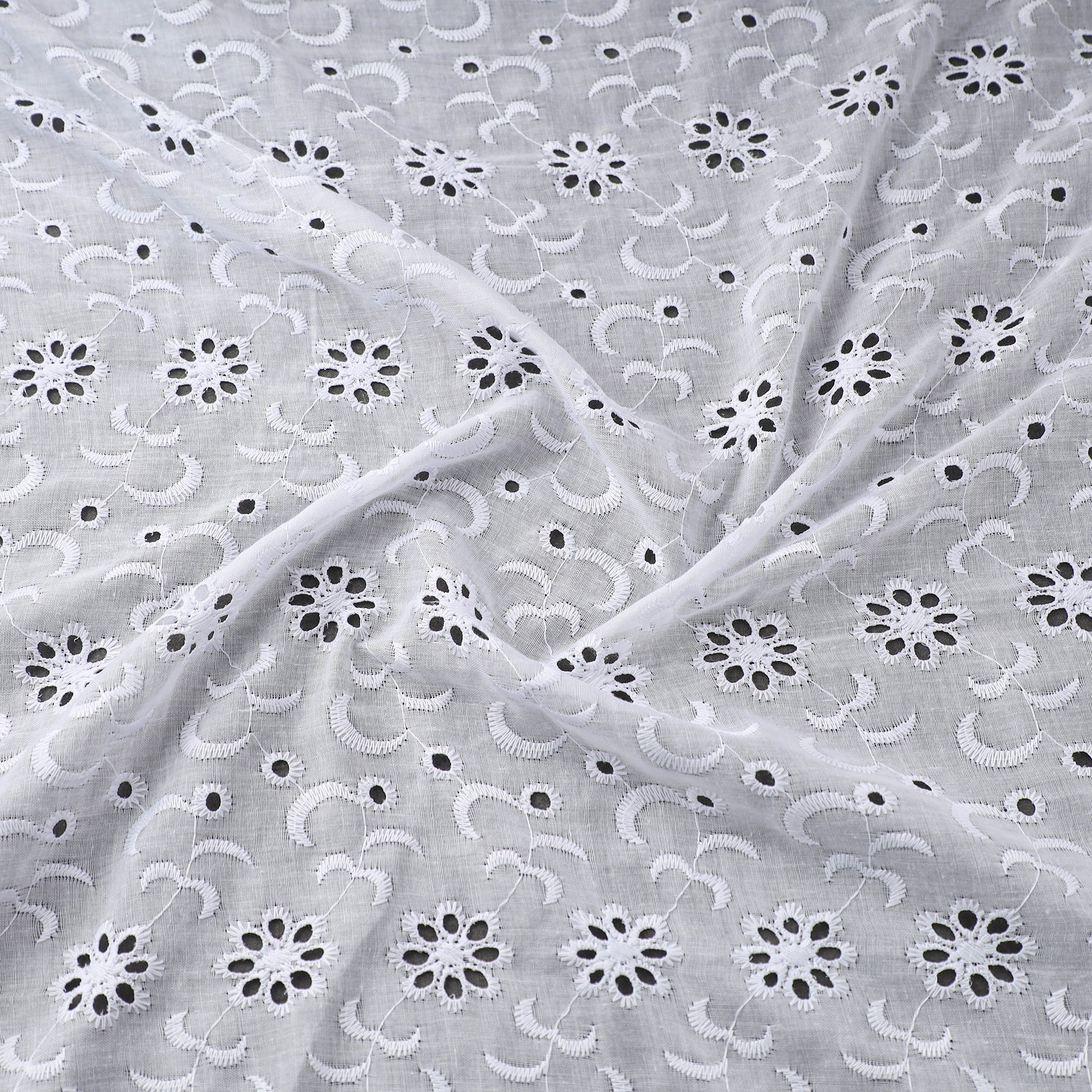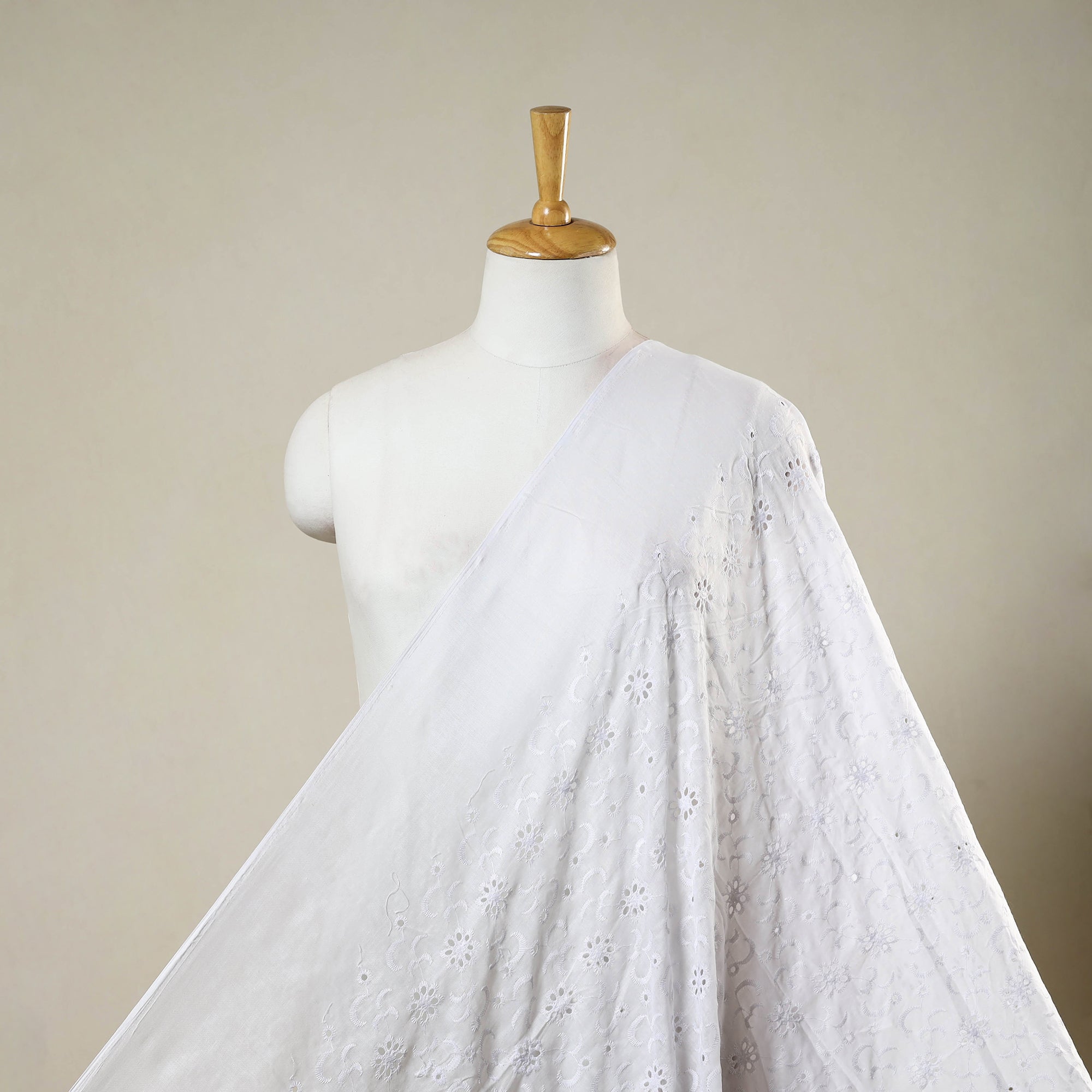 This floral embroidered white cotton hakoba fabric from Barmer, Rajasthan, blends elegance with comfort. Known for its airy cutwork embroidery and intricate eyelet patterns, this cotton hakoba fabric is a popular choice for blouses, kurtis, sarees, and dresses.