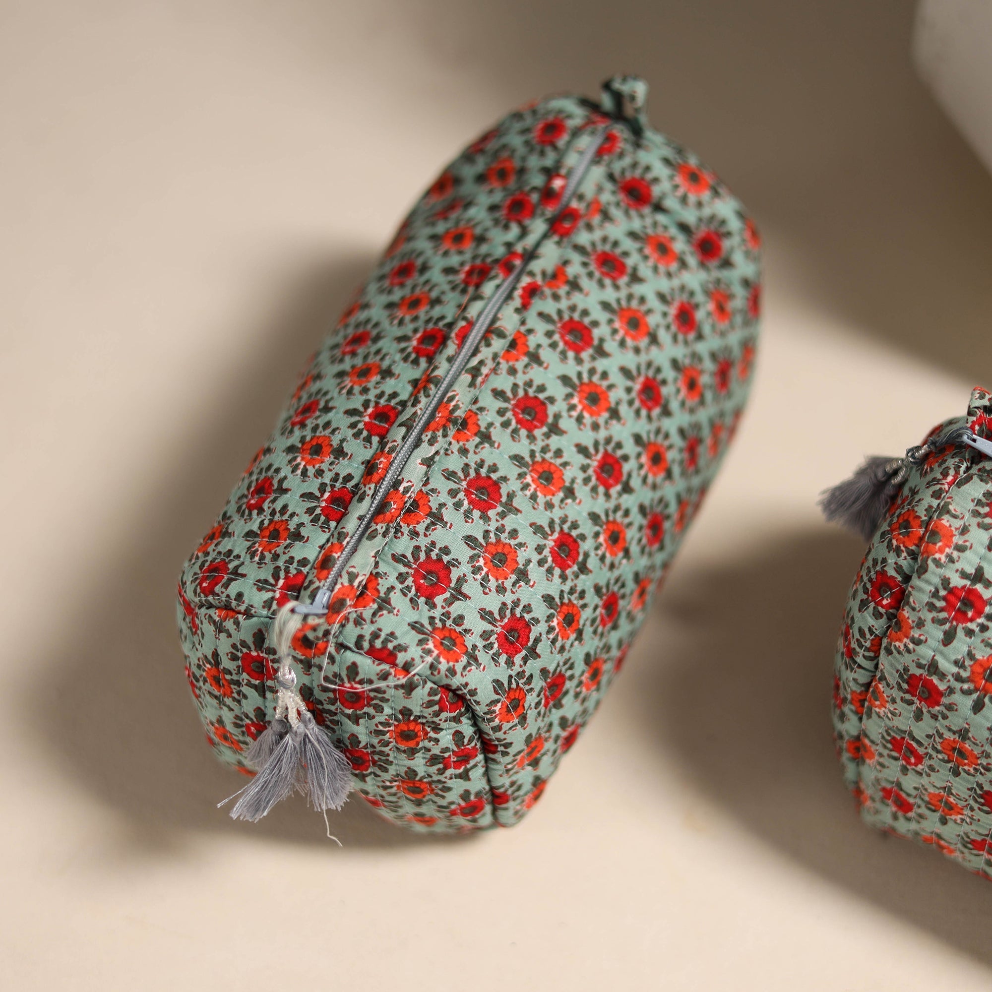 Green floral hand block print cotton quilted toiletry bag set of 3 combines beauty and utility perfectly. Each bag features a spacious main compartment and four inner pockets to neatly organize your essentials. Adorned with traditional sanganeri prints, these quilted bags add a charming Indian touch to your everyday travel and storage routine.