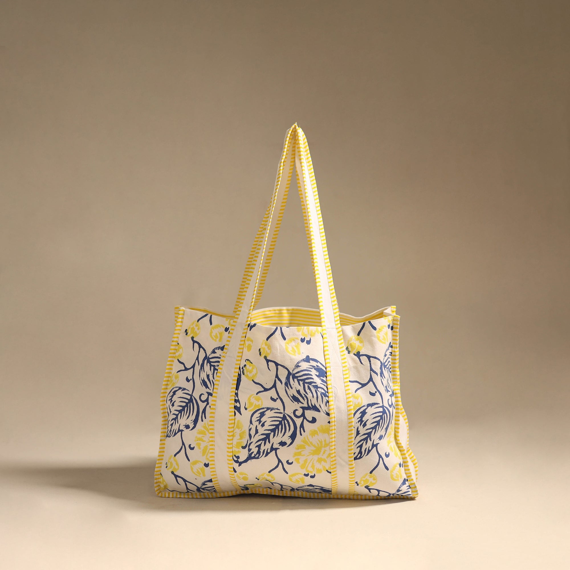Yellow floral block print canvas cotton tote bag is perfect for everyday use. It has a roomy main compartment and an inner pocket to keep your essentials neatly organized. The traditional sanganeri prints add a touch of Indian elegance, making it ideal for shopping, travel or daily outings.