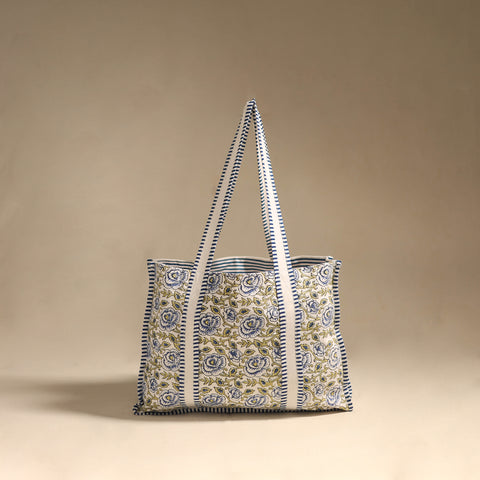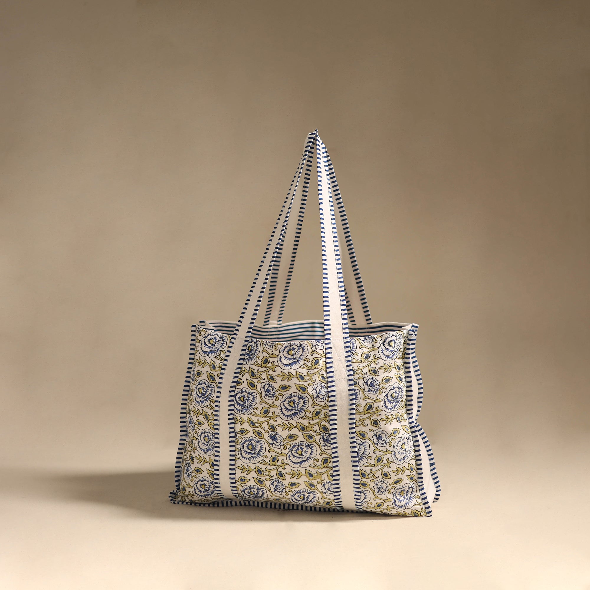Blue floral block print canvas cotton tote bag is perfect for everyday use. It has a roomy main compartment and an inner pocket to keep your essentials neatly organized. The traditional sanganeri prints add a touch of Indian elegance, making it ideal for shopping, travel or daily outings.