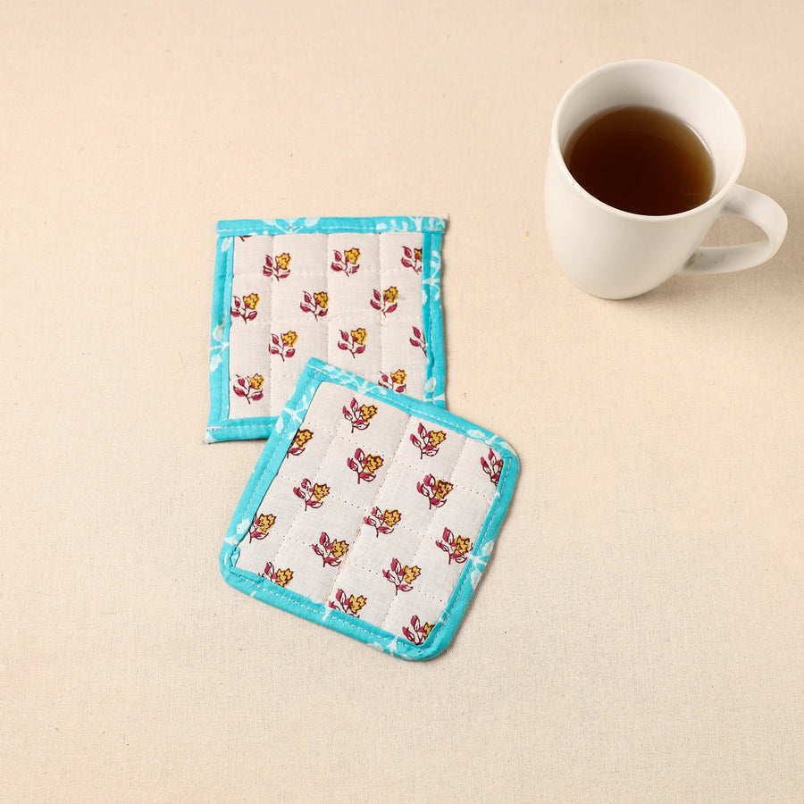 Enhance your table setting with these handcrafted floral print cotton quilted coasters (set of 2). Made from cotton, each coaster features vibrant patterns, combining functionality with a touch of artisanal charm. These coasters protect surfaces from stains and also bring sustainable elegance to your home