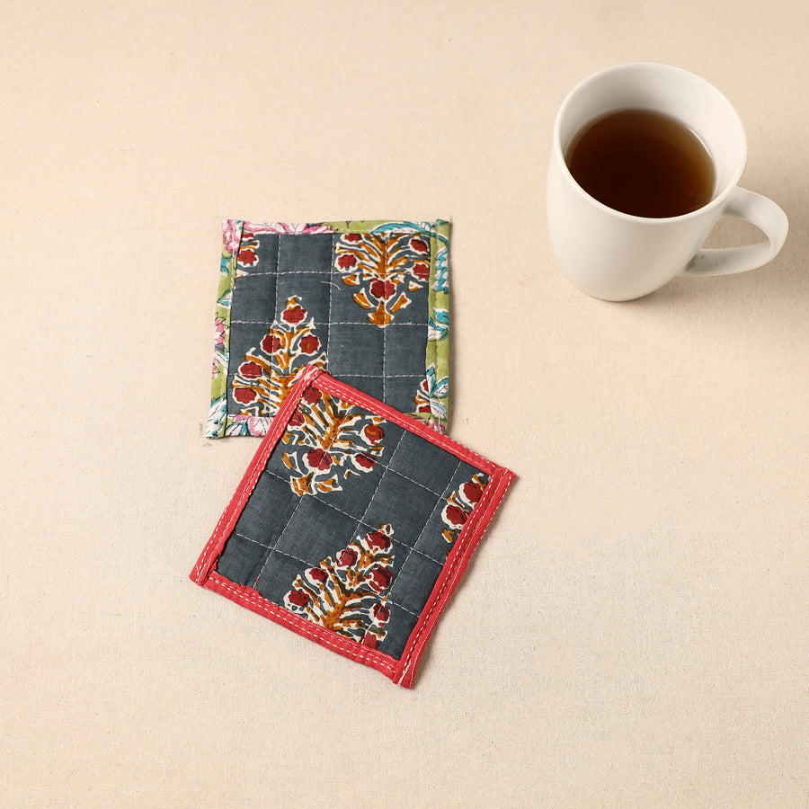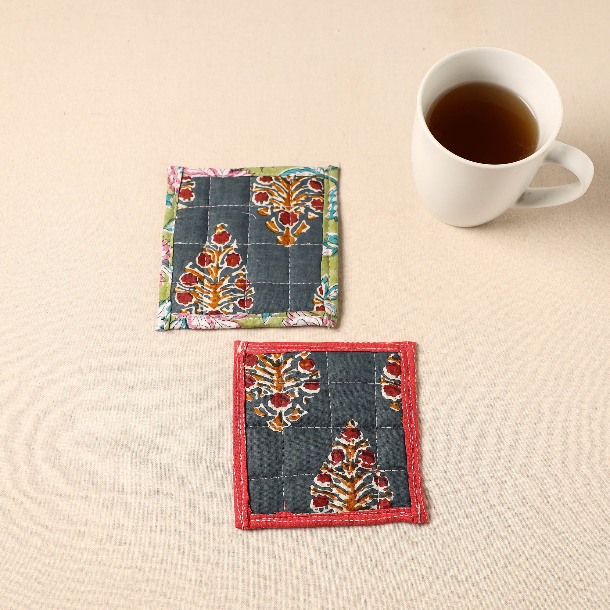 Enhance your table setting with these handcrafted floral print cotton quilted coasters (set of 2). Made from cotton, each coaster features vibrant patterns, combining functionality with a touch of artisanal charm. These coasters protect surfaces from stains and also bring sustainable elegance to your home