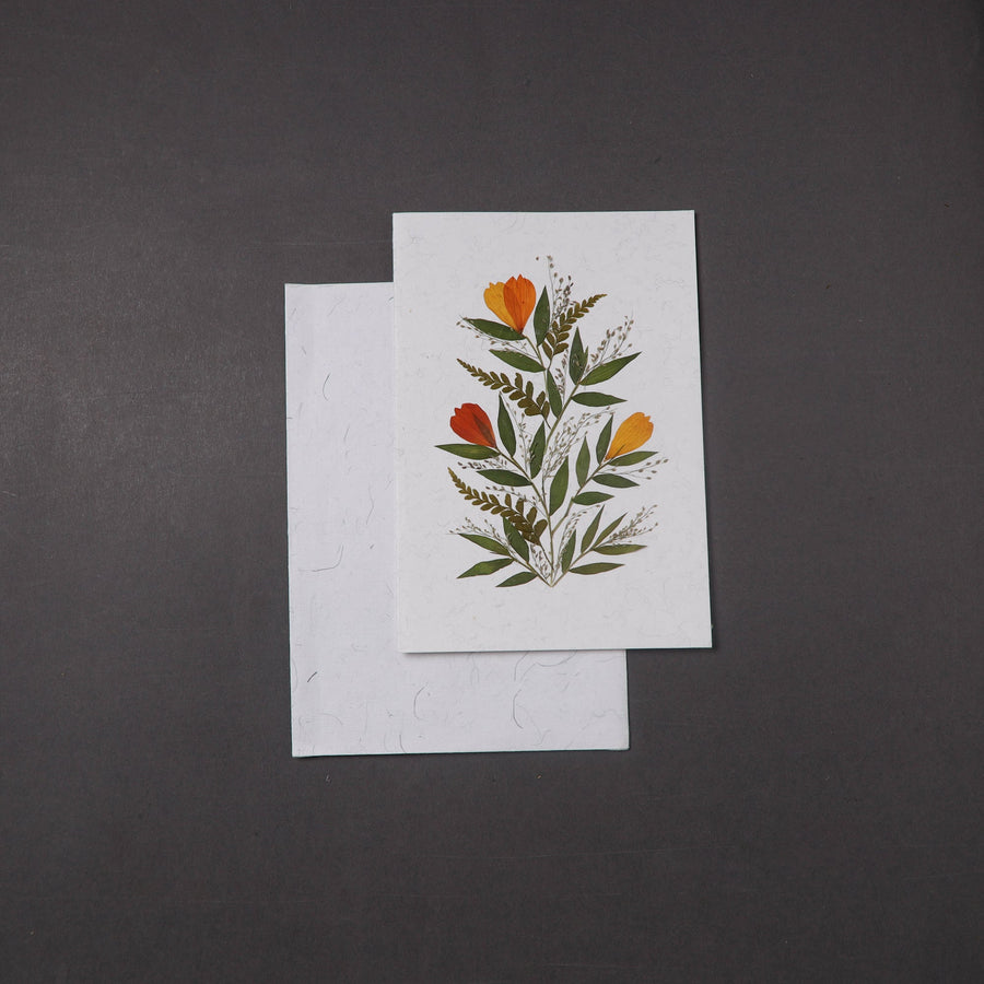 Capture the beauty of nature with flower art handmade greeting card. This card is crafted using recycled cotton and rice straw, featuring intricate pressed flowers and leaves that add a personal, eco-friendly touch. This card come with a matching envelope and are a true reflection of sustainable craftsmanship.