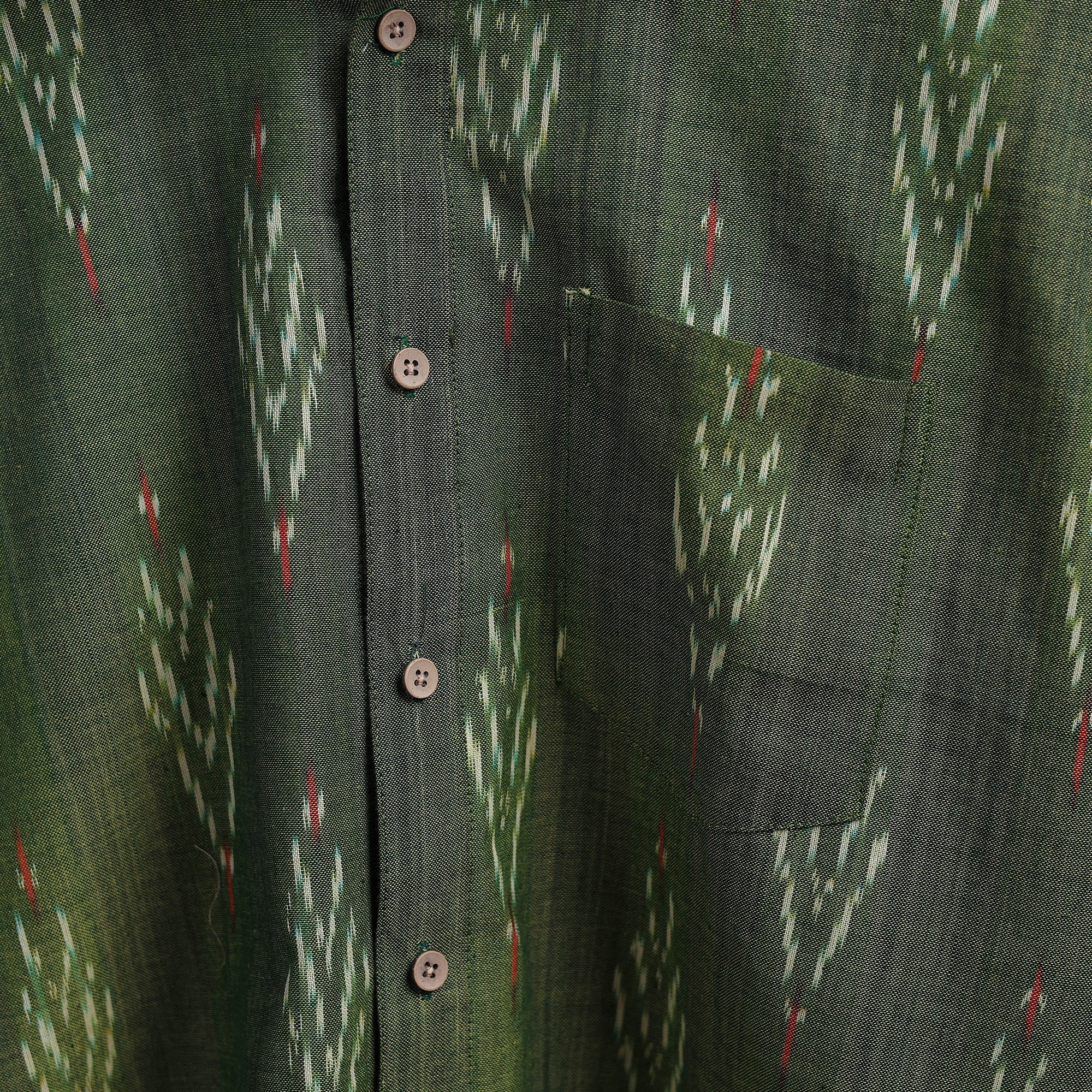This full sleeve men green cotton pochampally Ikat shirt features the traditional Ikat dyeing technique, creating vibrant, geometric patterns that stand out effortlessly. Crafted from breathable cotton, it offers lasting comfort and style. Accented with crisp wooden buttons and a practical patch pocket, this shirt blends classic design with artisanal charm perfect for both casual and semi-formal occasions.