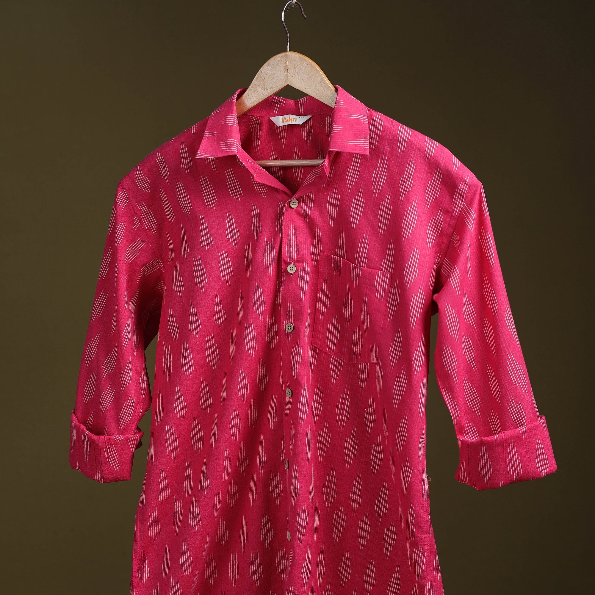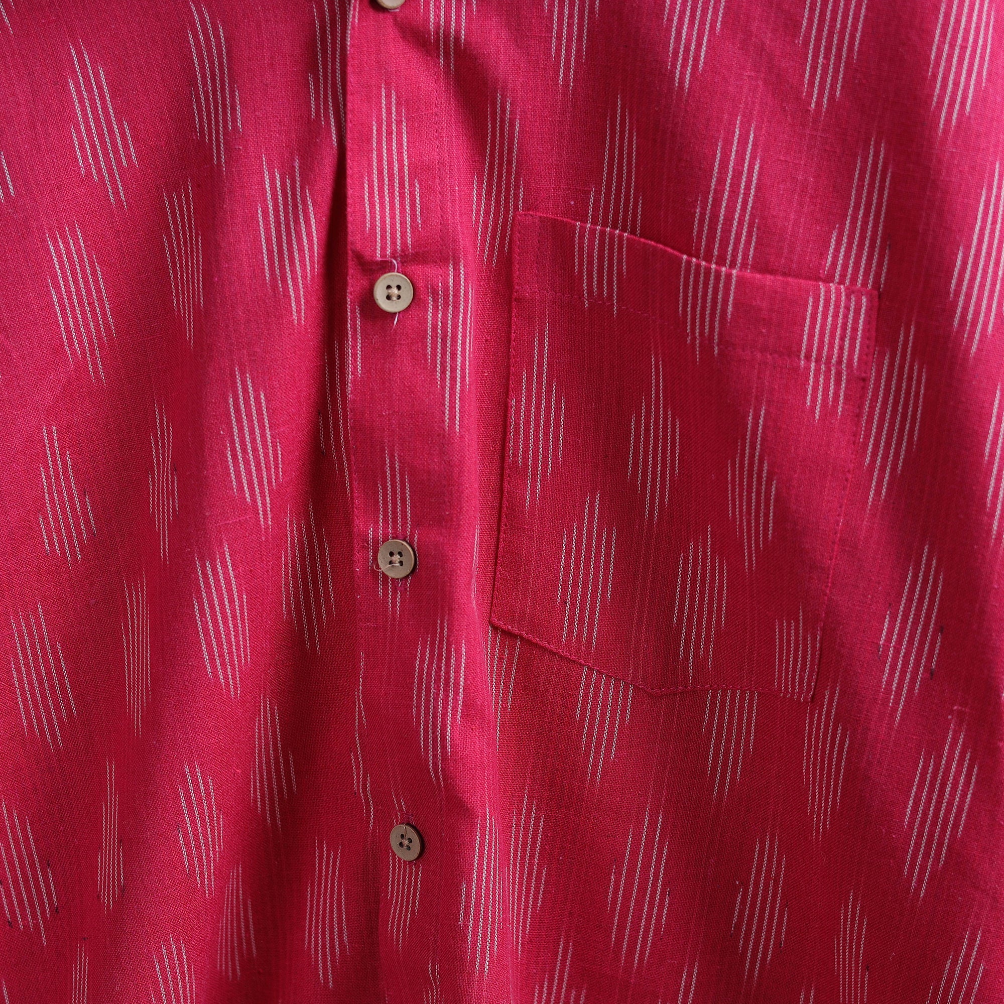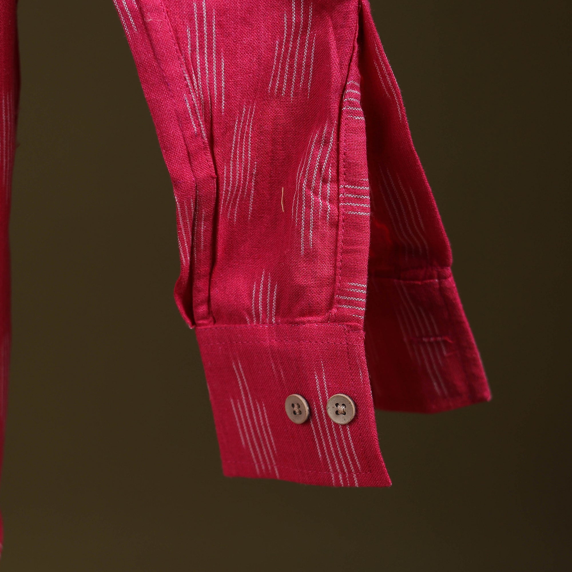 This full sleeve men pink cotton pochampally Ikat shirt features the traditional Ikat dyeing technique, creating vibrant, geometric patterns that stand out effortlessly. Crafted from breathable cotton, it offers lasting comfort and style. Accented with crisp wooden buttons and a practical patch pocket, this shirt blends classic design with artisanal charm perfect for both casual and semi-formal occasions.