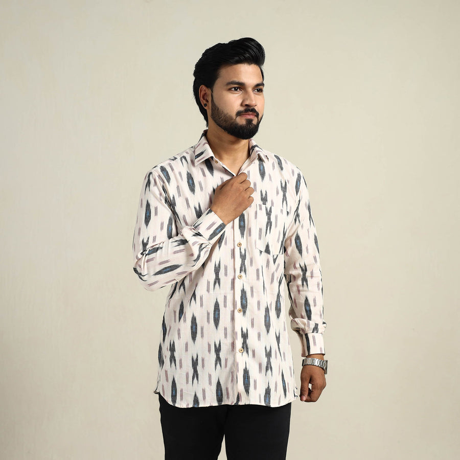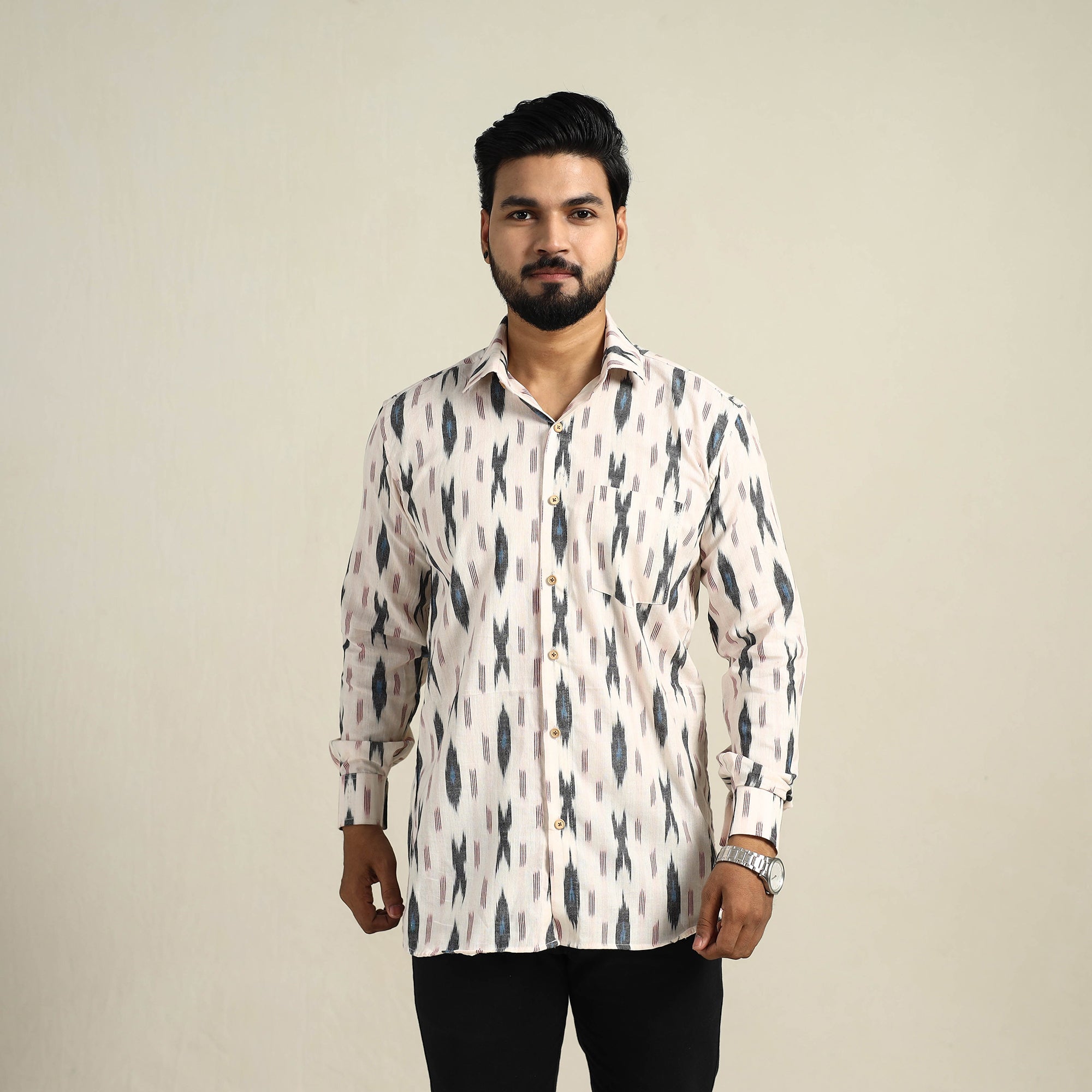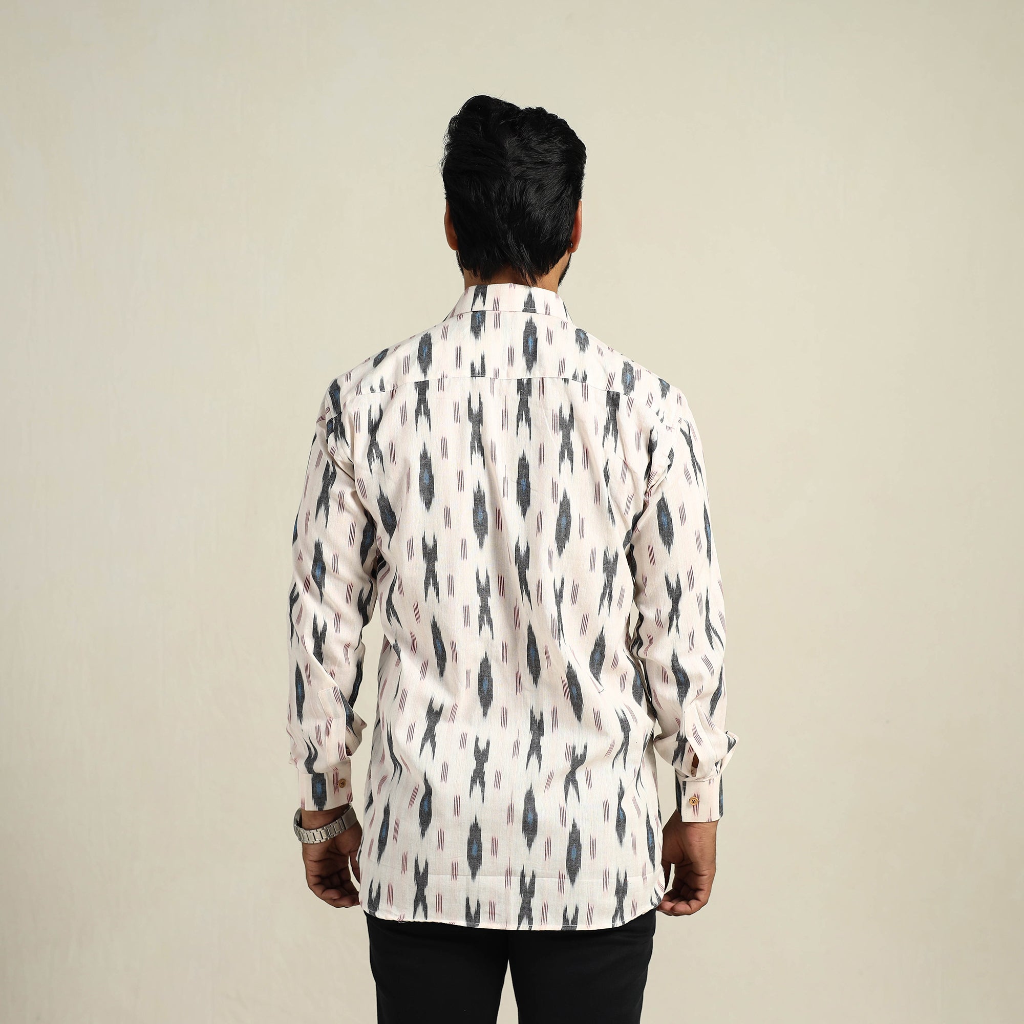 Full-sleeve men cotton white pochampally ikat shirt. This shirt showcases the intricate Ikat dyeing technique, resulting in unique, vibrant patterns. Made from cotton, it ensures all-day comfort. The addition of crisp wooden buttons, full sleeve, and a practical patch pocket. Elevate your look with the artistry of Ikat