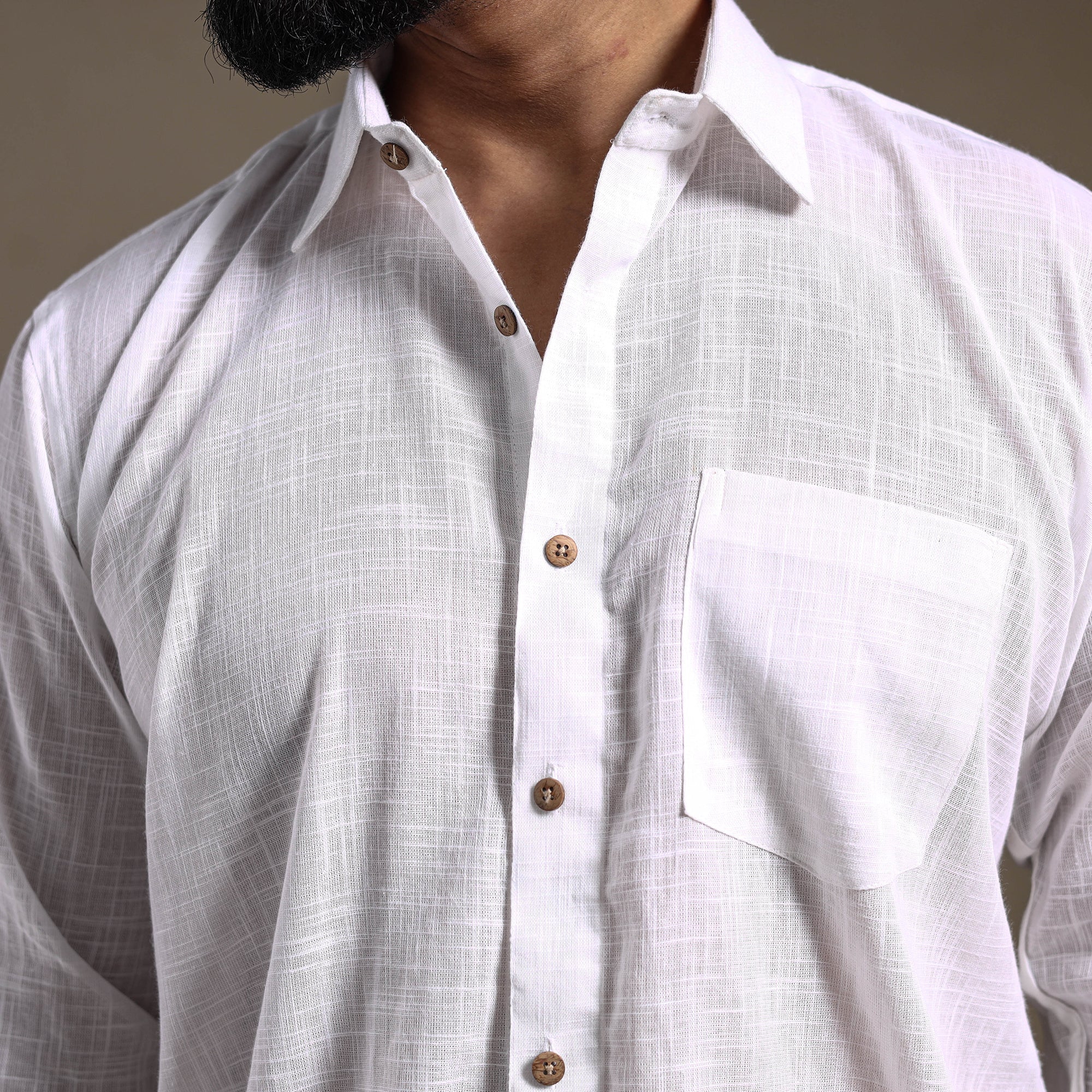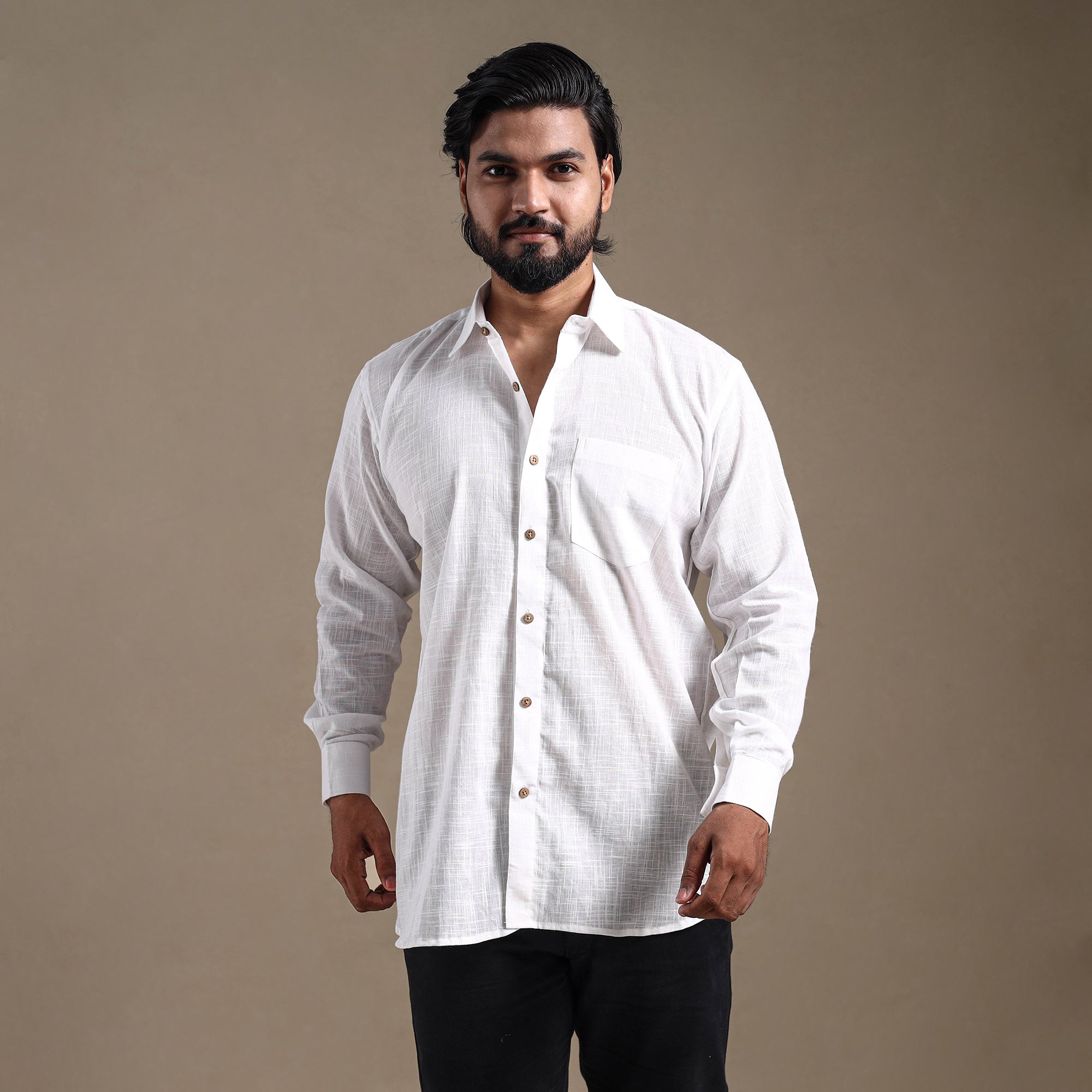 This white full sleeve plain men’s shirt is a perfect blend of style and comfort. Crafted from slub cotton, it features a slightly uneven texture with thicker and thinner threads that add a distinctive look and feel. Designed with a regular collar and half sleeves, it’s ideal for casual wear. Wooden buttons enhance its natural charm.