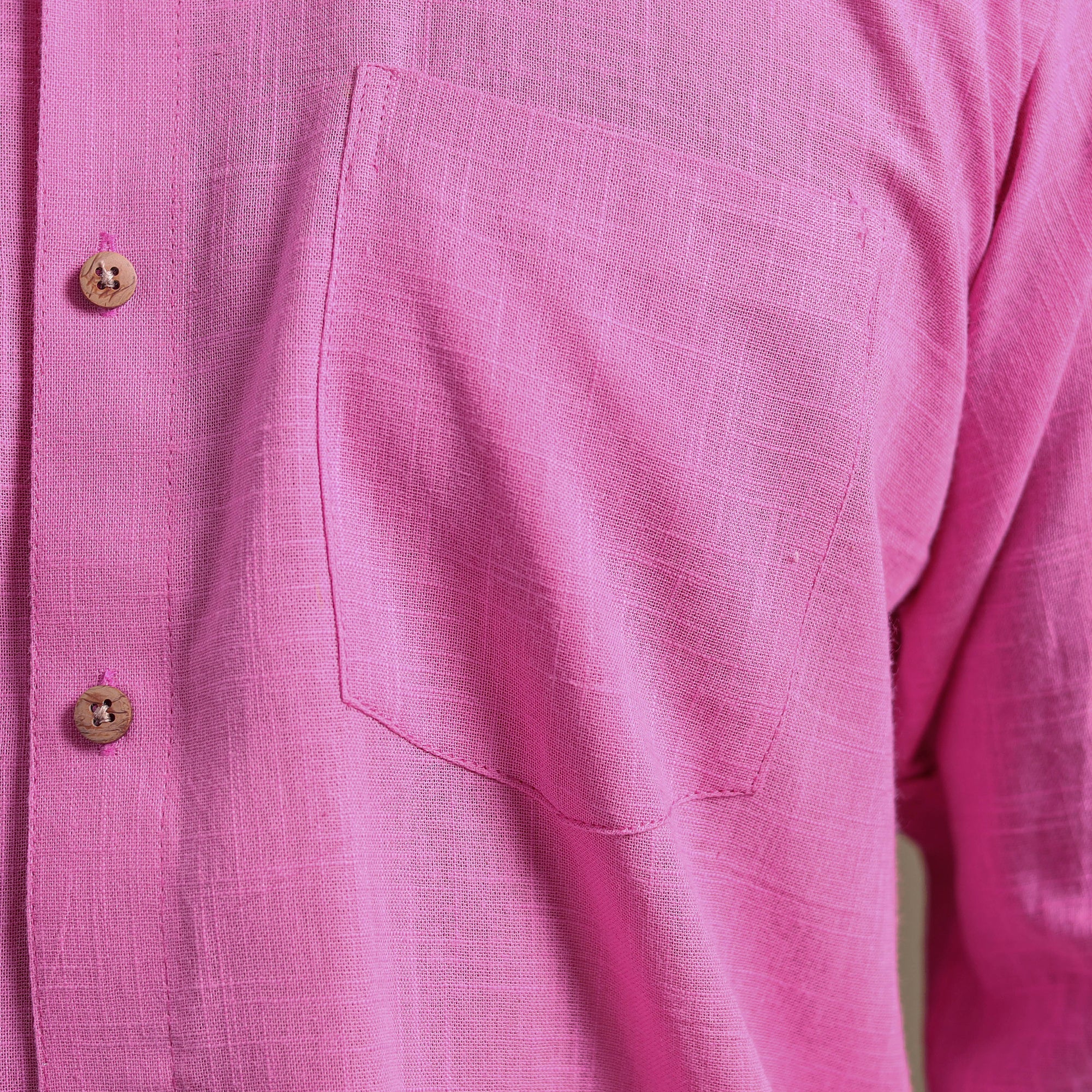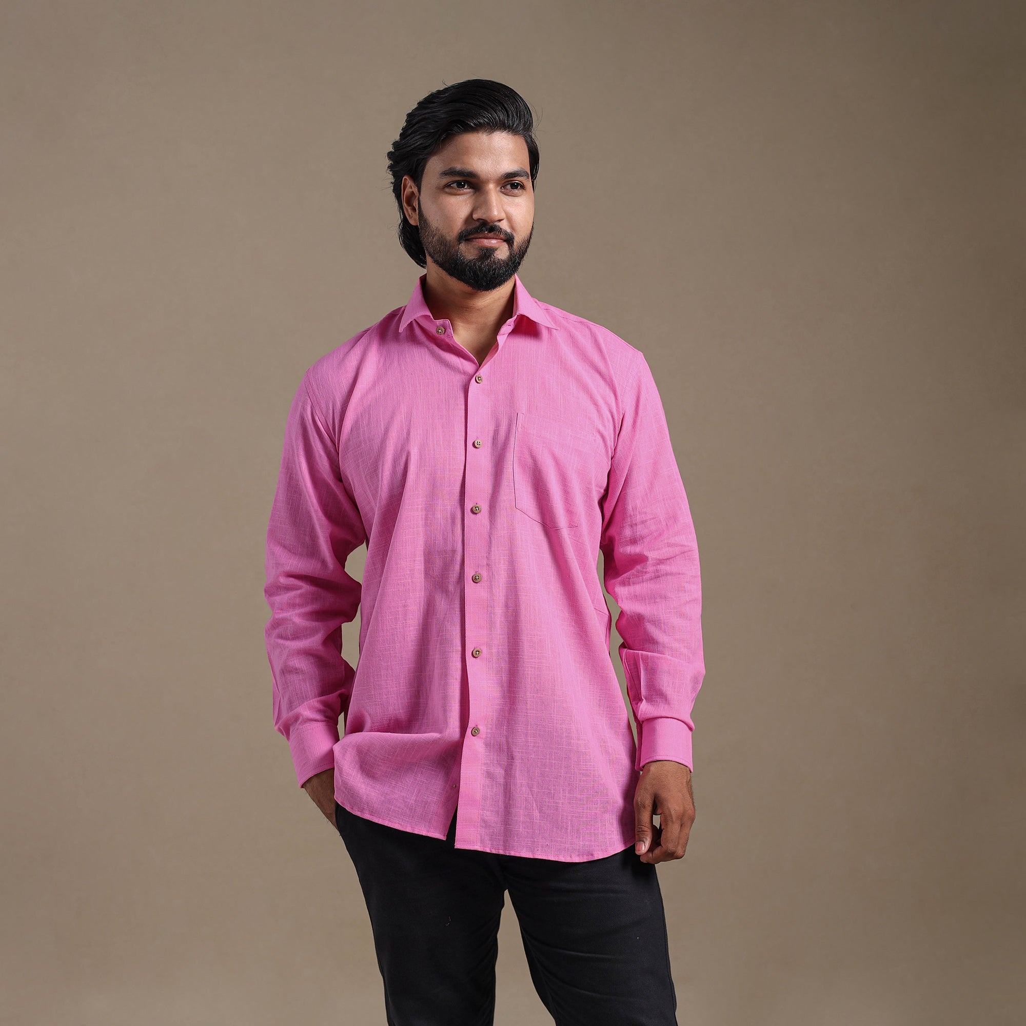This pink full sleeve plain men’s shirt is a perfect blend of style and comfort. Crafted from slub cotton, it features a slightly uneven texture with thicker and thinner threads that add a distinctive look and feel. Designed with a regular collar and half sleeves, it’s ideal for casual wear. Wooden buttons enhance its natural charm.