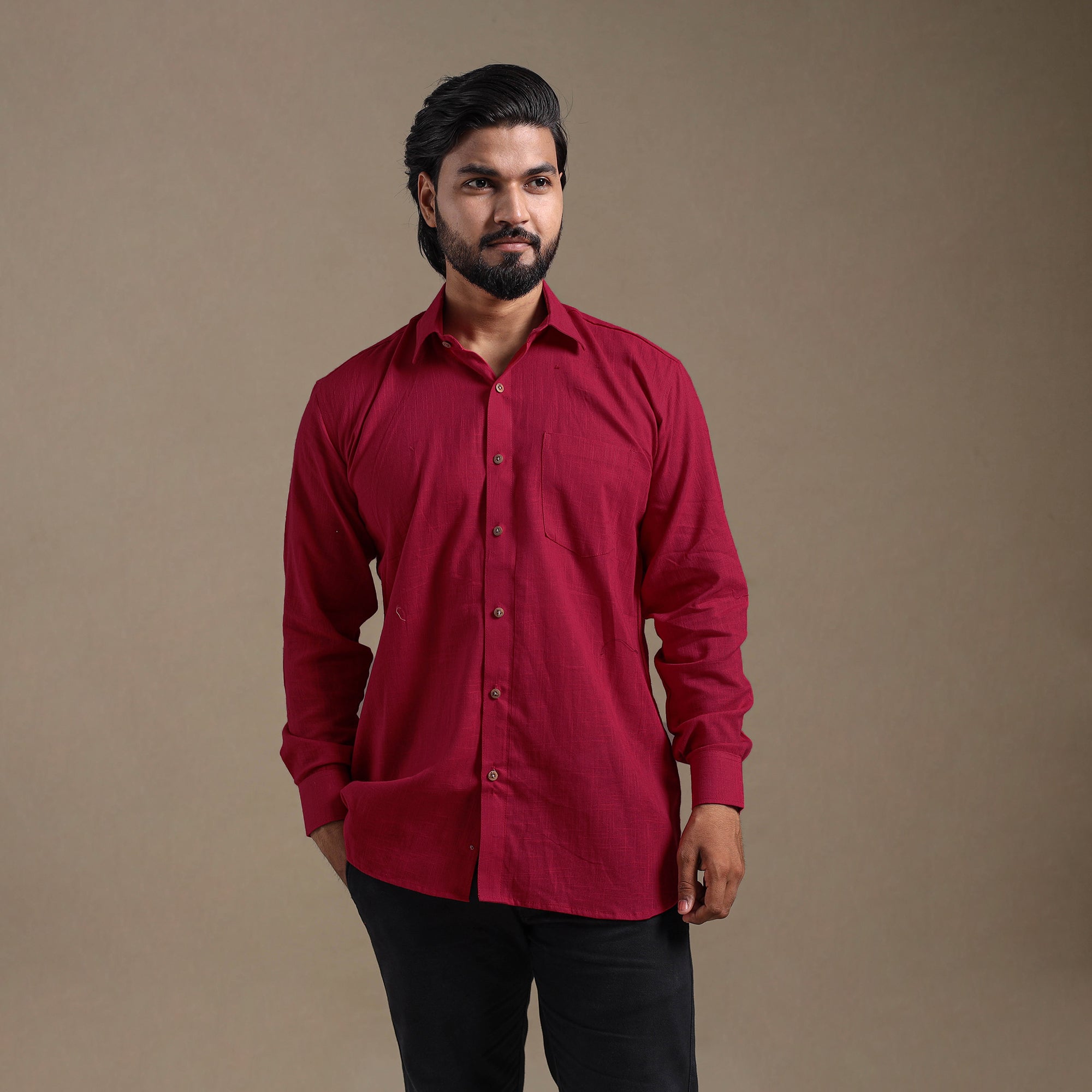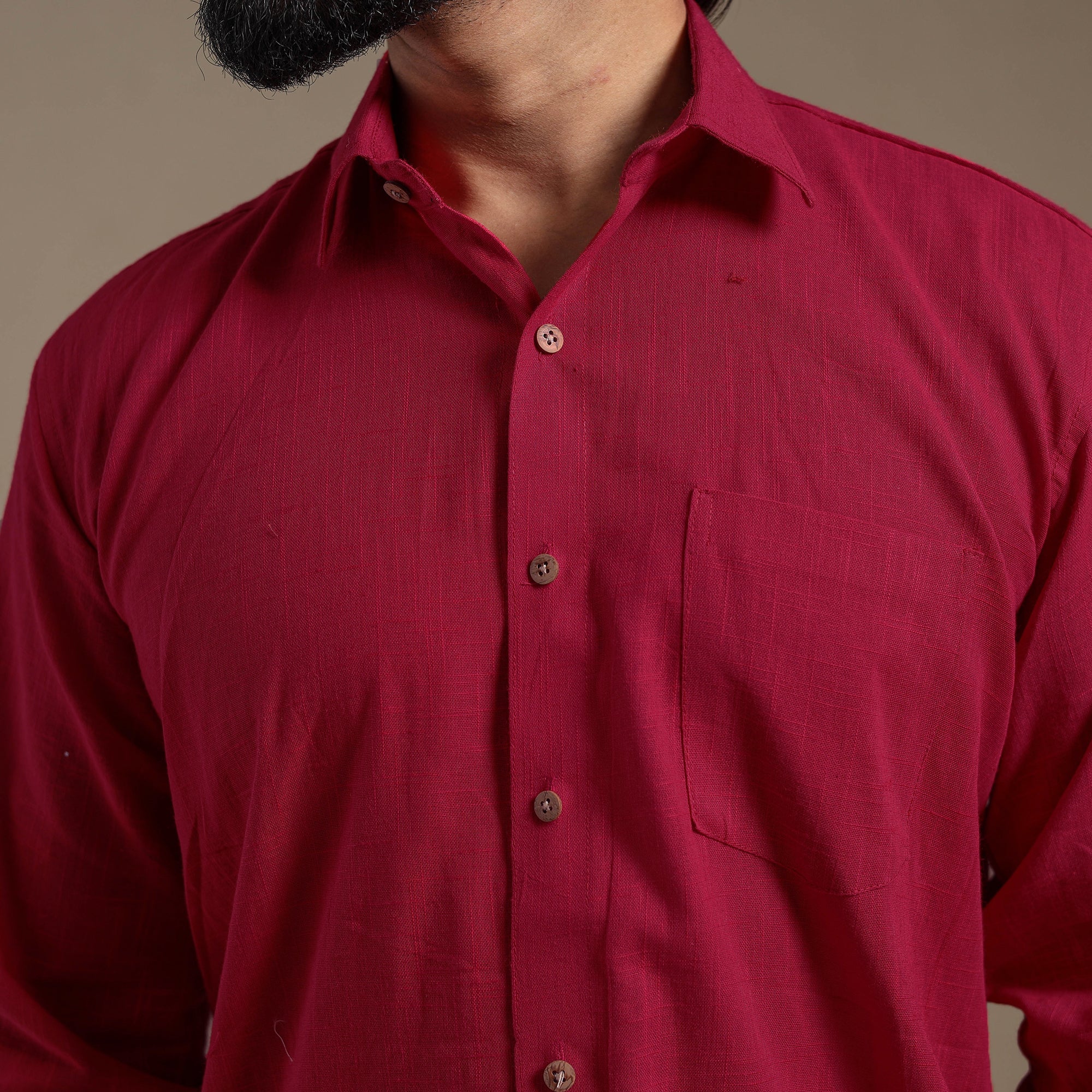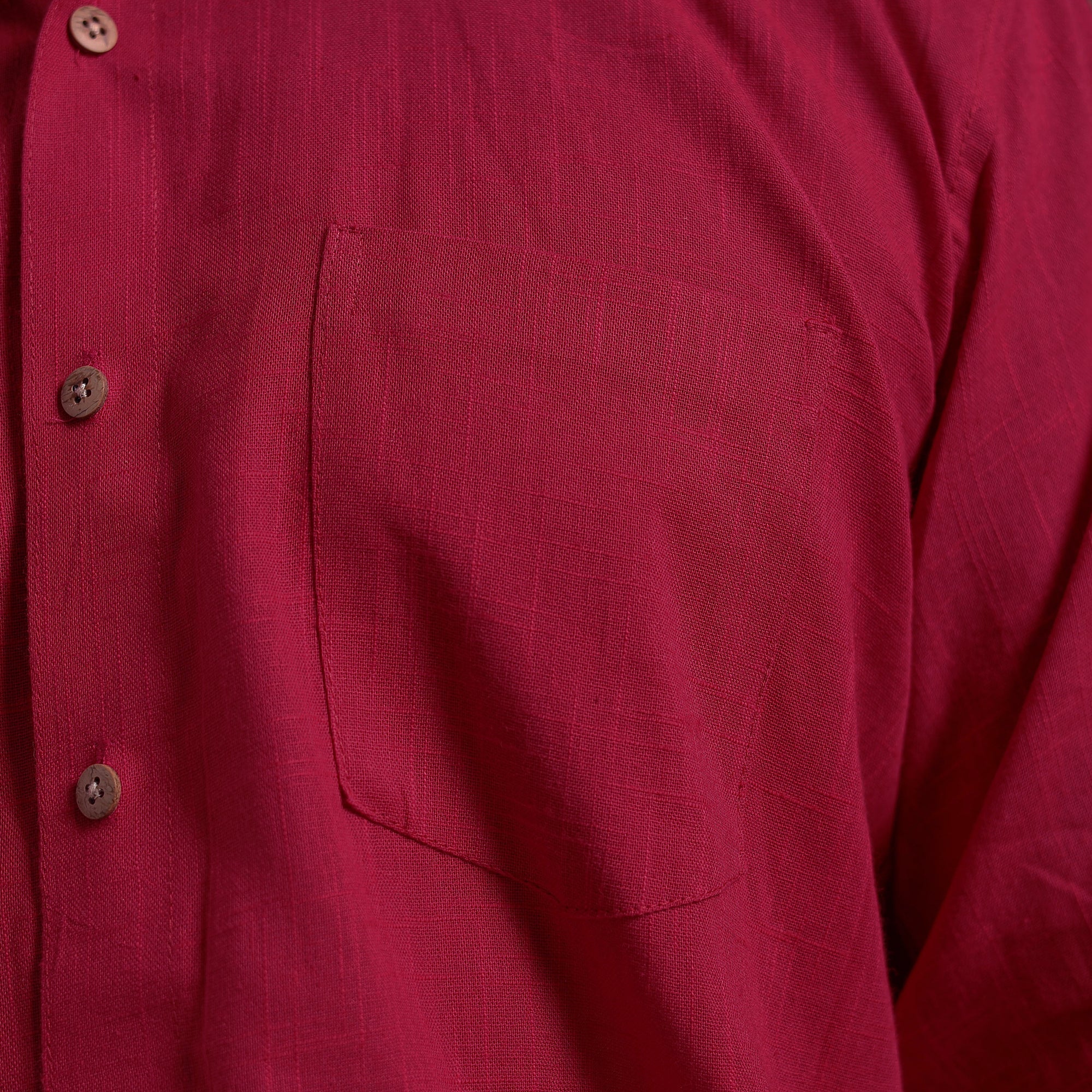 This maroon full sleeve plain men’s shirt is a perfect blend of style and comfort. Crafted from slub cotton, it features a slightly uneven texture with thicker and thinner threads that add a distinctive look and feel. Designed with a regular collar and half sleeves, it’s ideal for casual wear. Wooden buttons enhance its natural charm.
