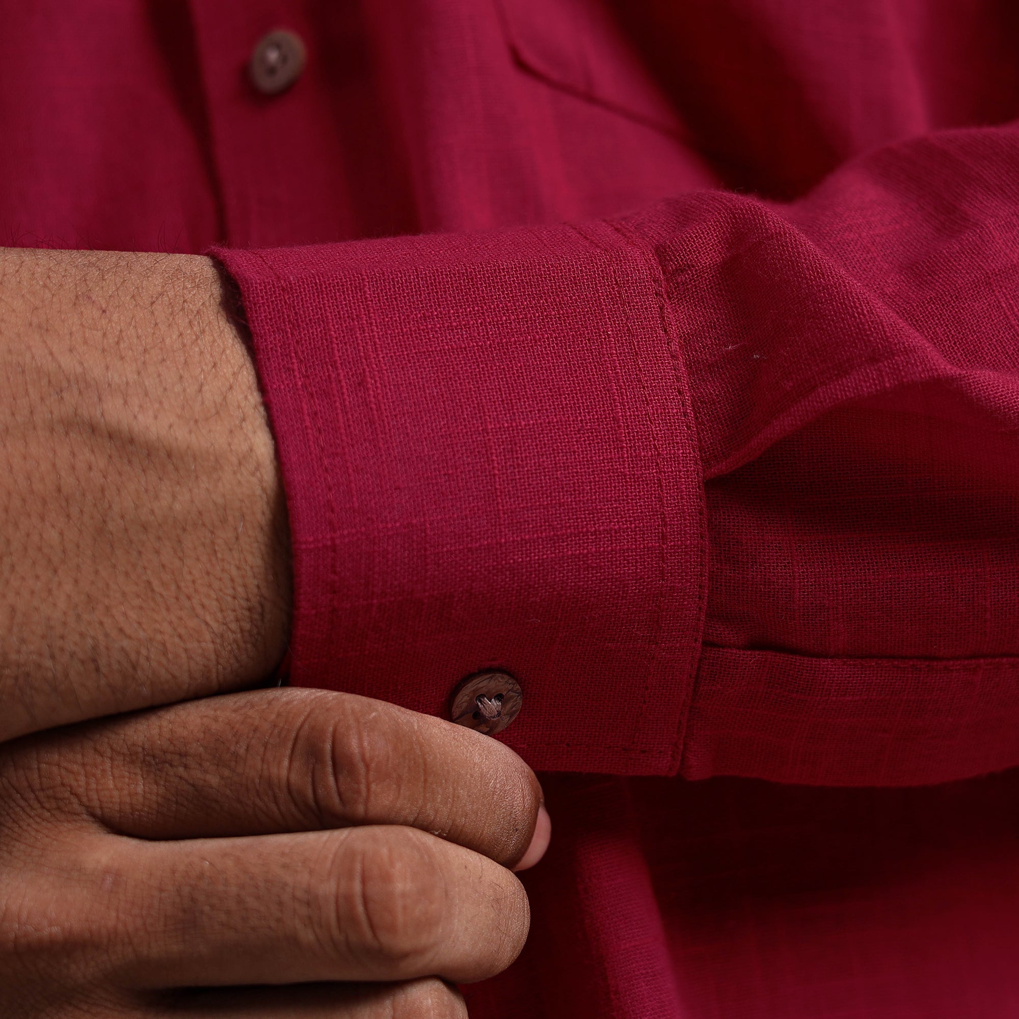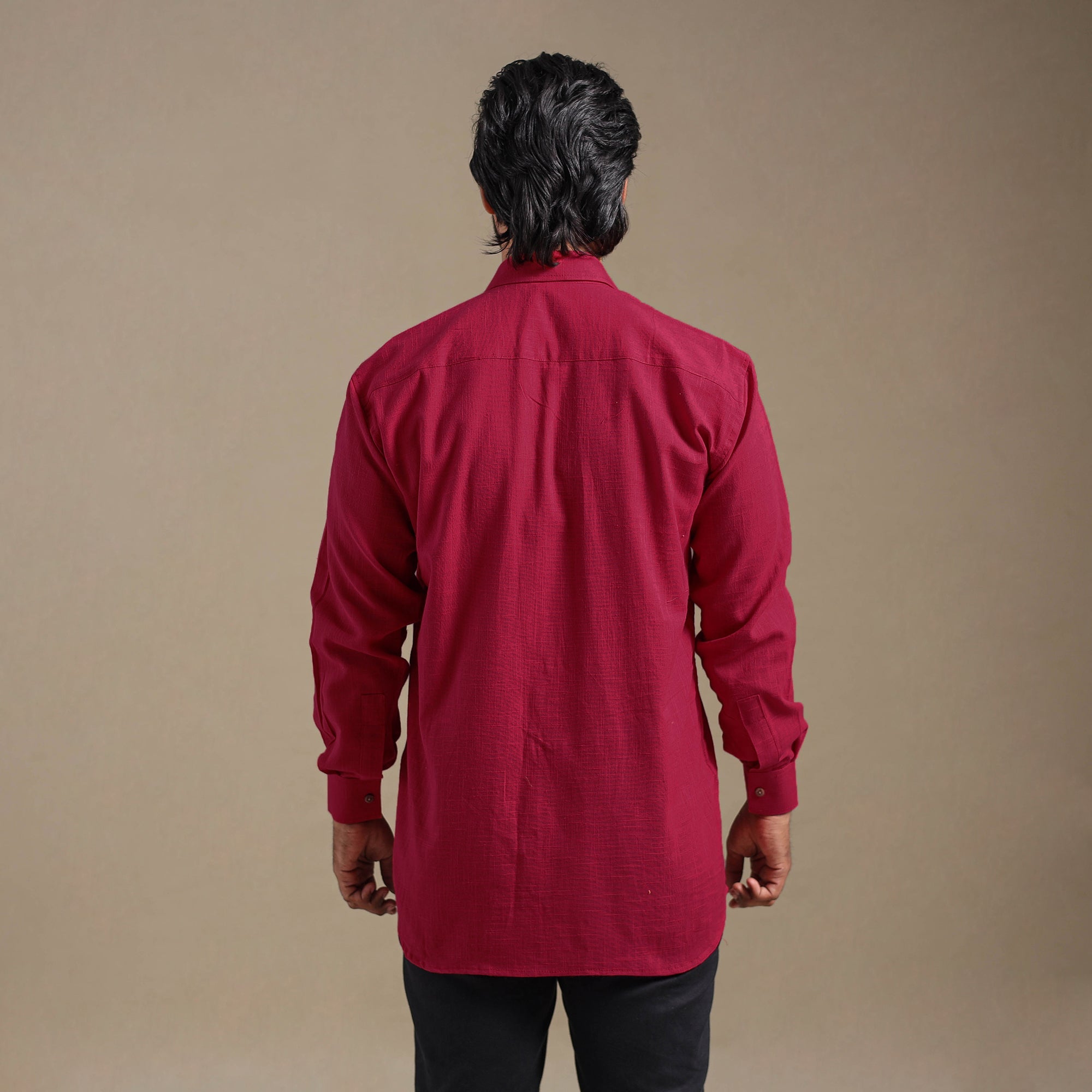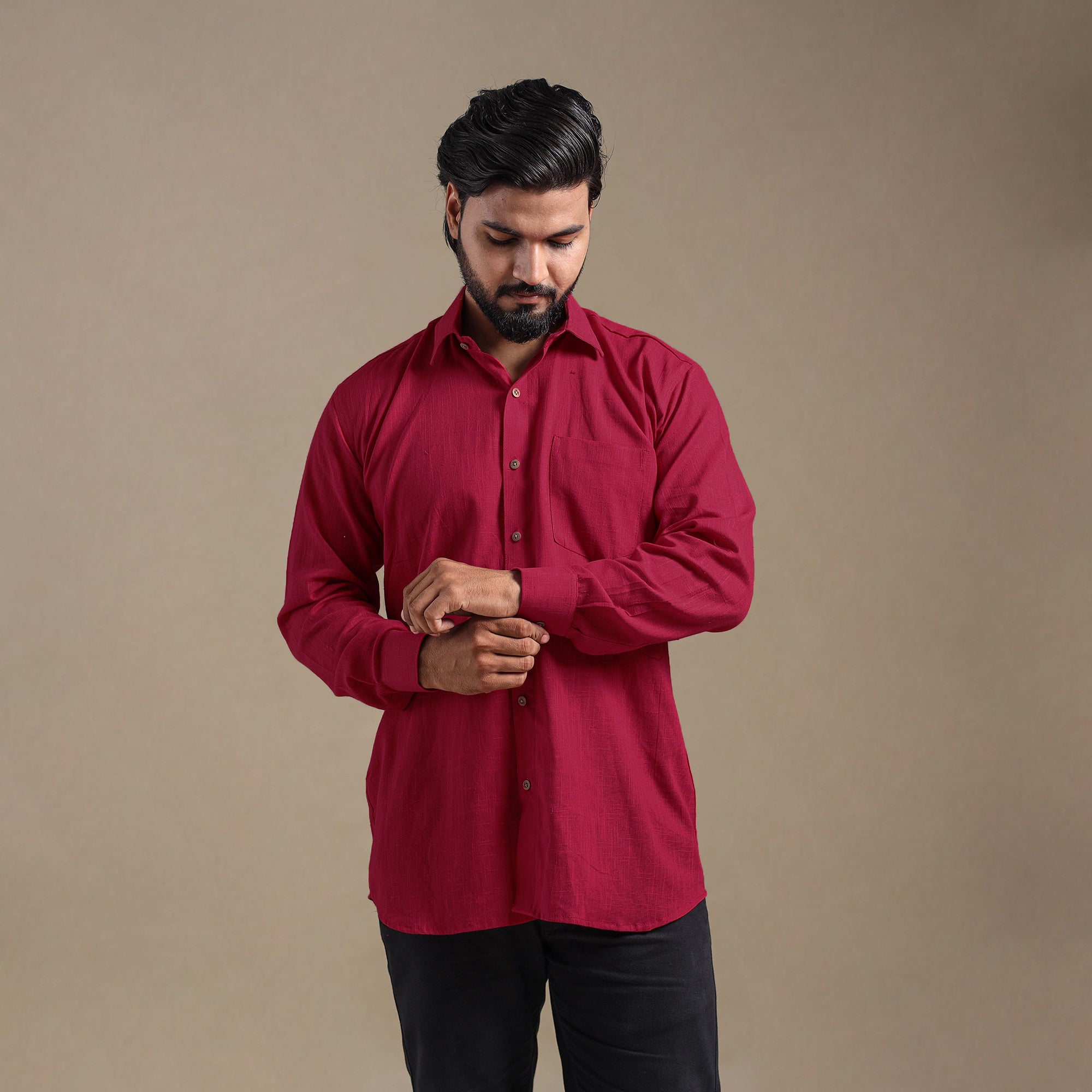 This maroon full sleeve plain men’s shirt is a perfect blend of style and comfort. Crafted from slub cotton, it features a slightly uneven texture with thicker and thinner threads that add a distinctive look and feel. Designed with a regular collar and half sleeves, it’s ideal for casual wear. Wooden buttons enhance its natural charm.