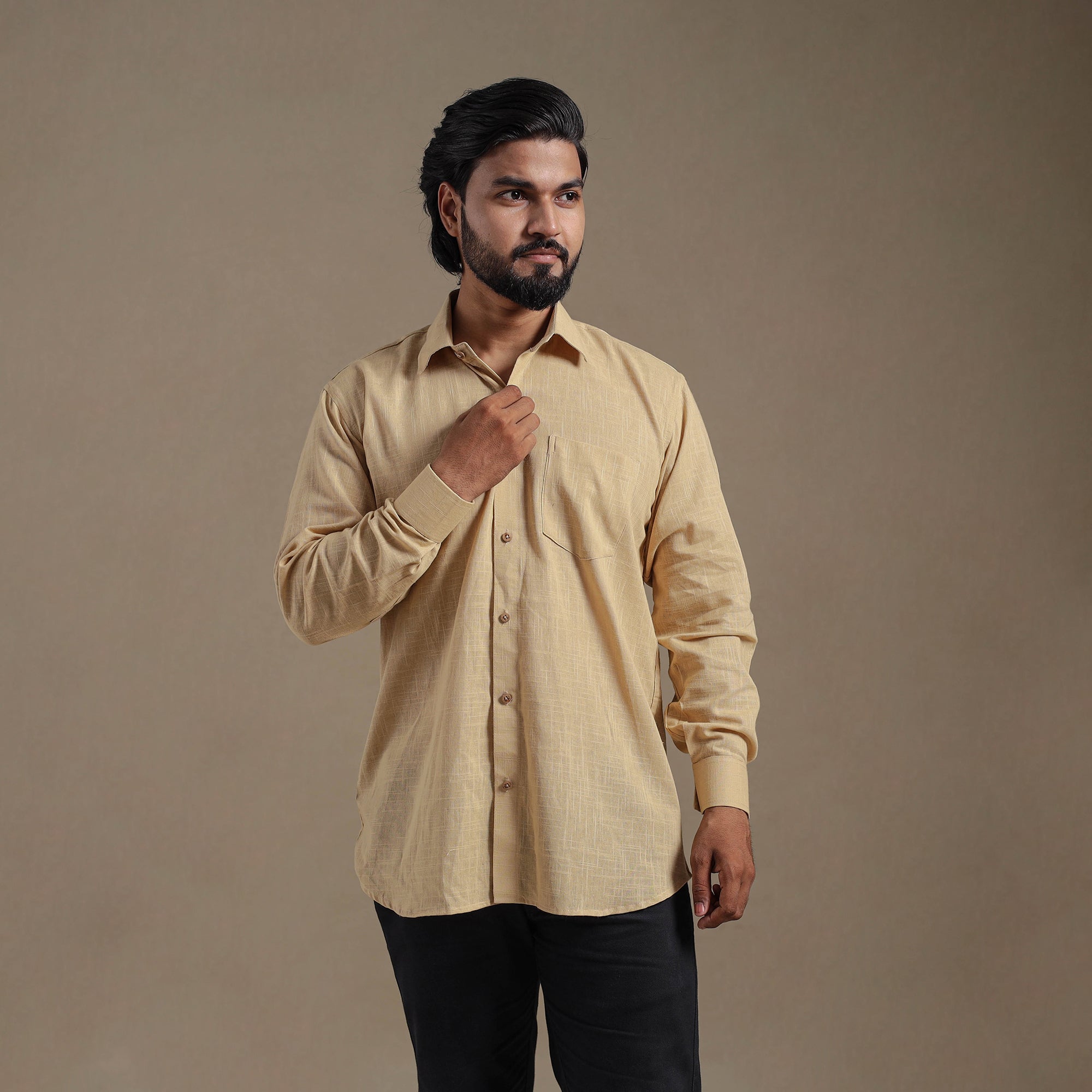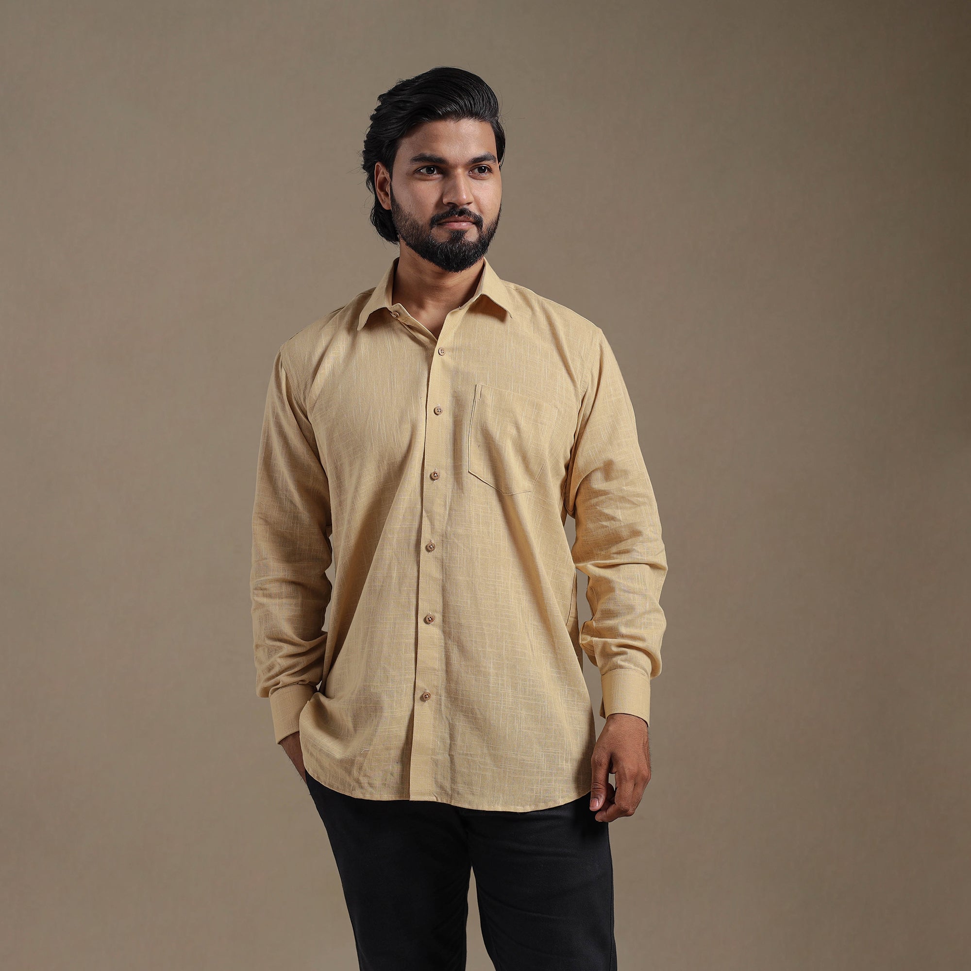 This beige full sleeve plain men’s shirt is a perfect blend of style and comfort. Crafted from slub cotton, it features a slightly uneven texture with thicker and thinner threads that add a distinctive look and feel. Designed with a regular collar and half sleeves, it’s ideal for casual wear. Wooden buttons enhance its natural charm.