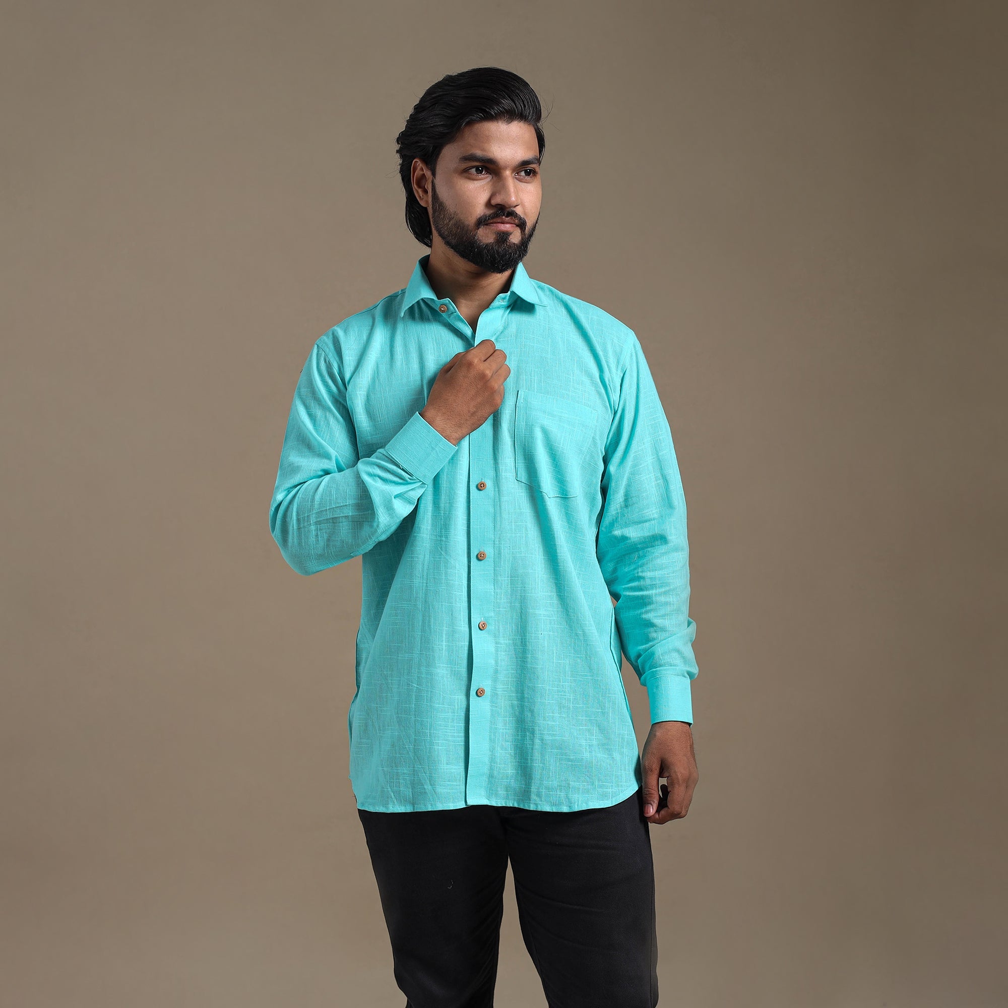 This blue full sleeve plain men’s shirt is a perfect blend of style and comfort. Crafted from slub cotton, it features a slightly uneven texture with thicker and thinner threads that add a distinctive look and feel. Designed with a regular collar and half sleeves, it’s ideal for casual wear. Wooden buttons enhance its natural charm.