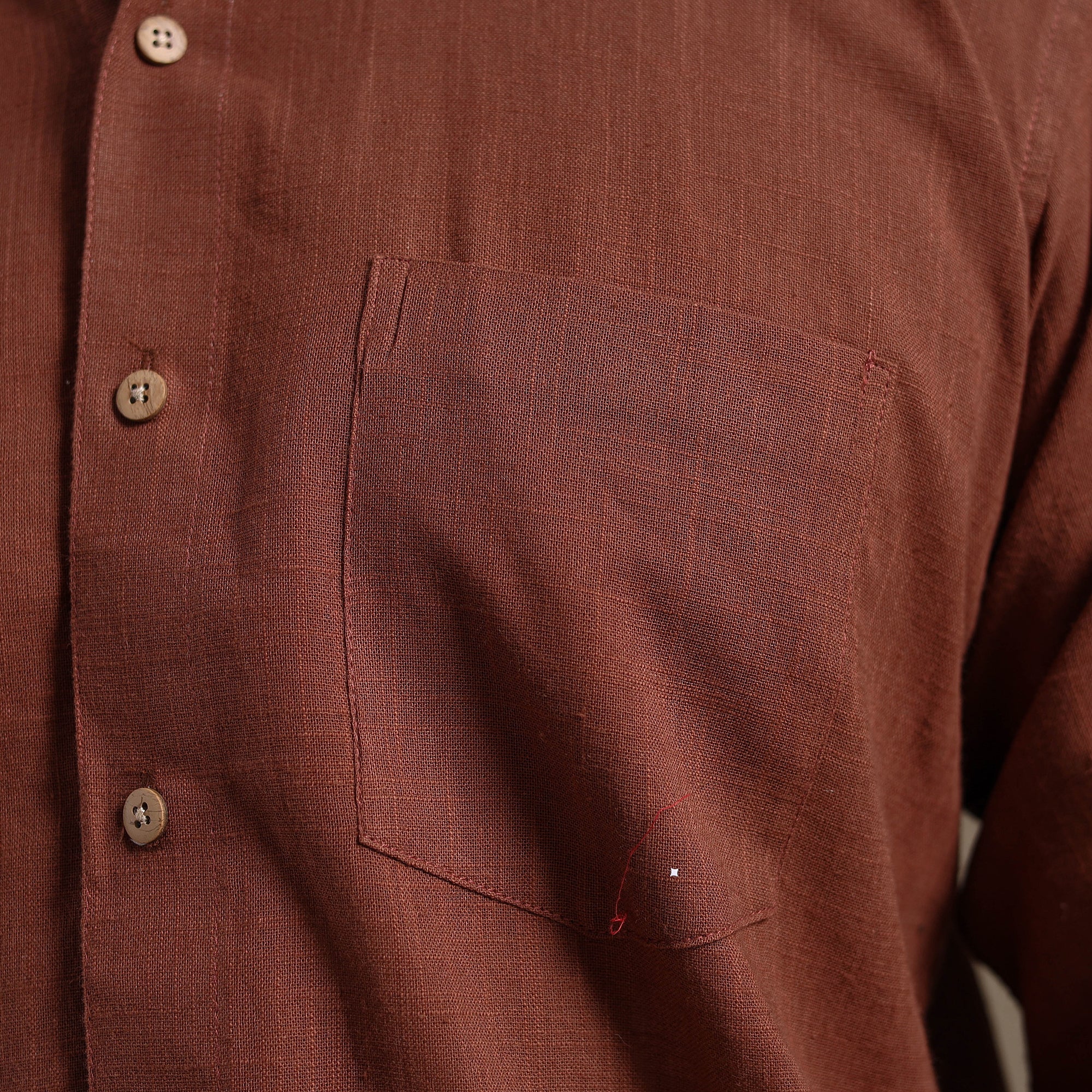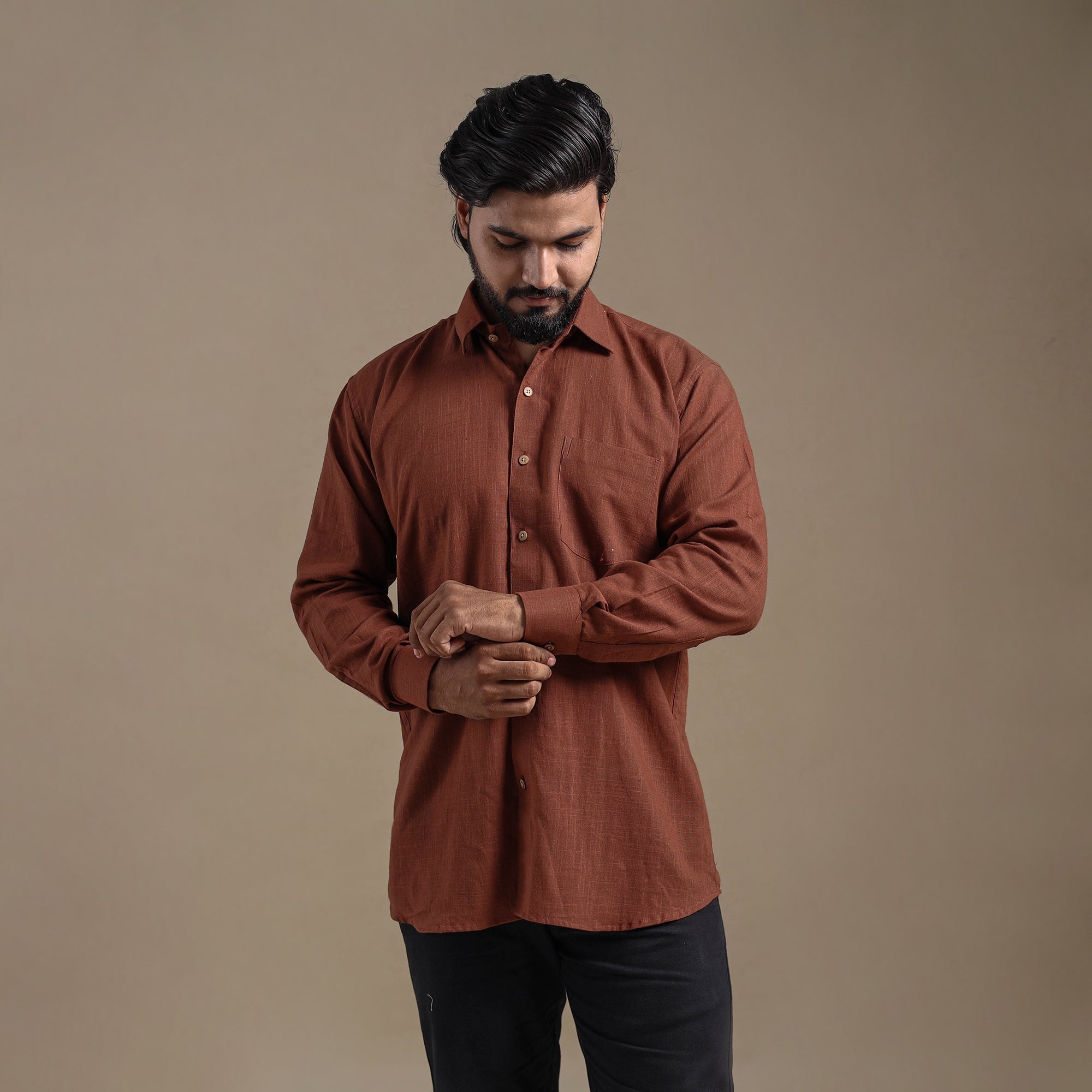 This brown full sleeve plain men’s shirt is a perfect blend of style and comfort. Crafted from slub cotton, it features a slightly uneven texture with thicker and thinner threads that add a distinctive look and feel. Designed with a regular collar and half sleeves, it’s ideal for casual wear. Wooden buttons enhance its natural charm.
