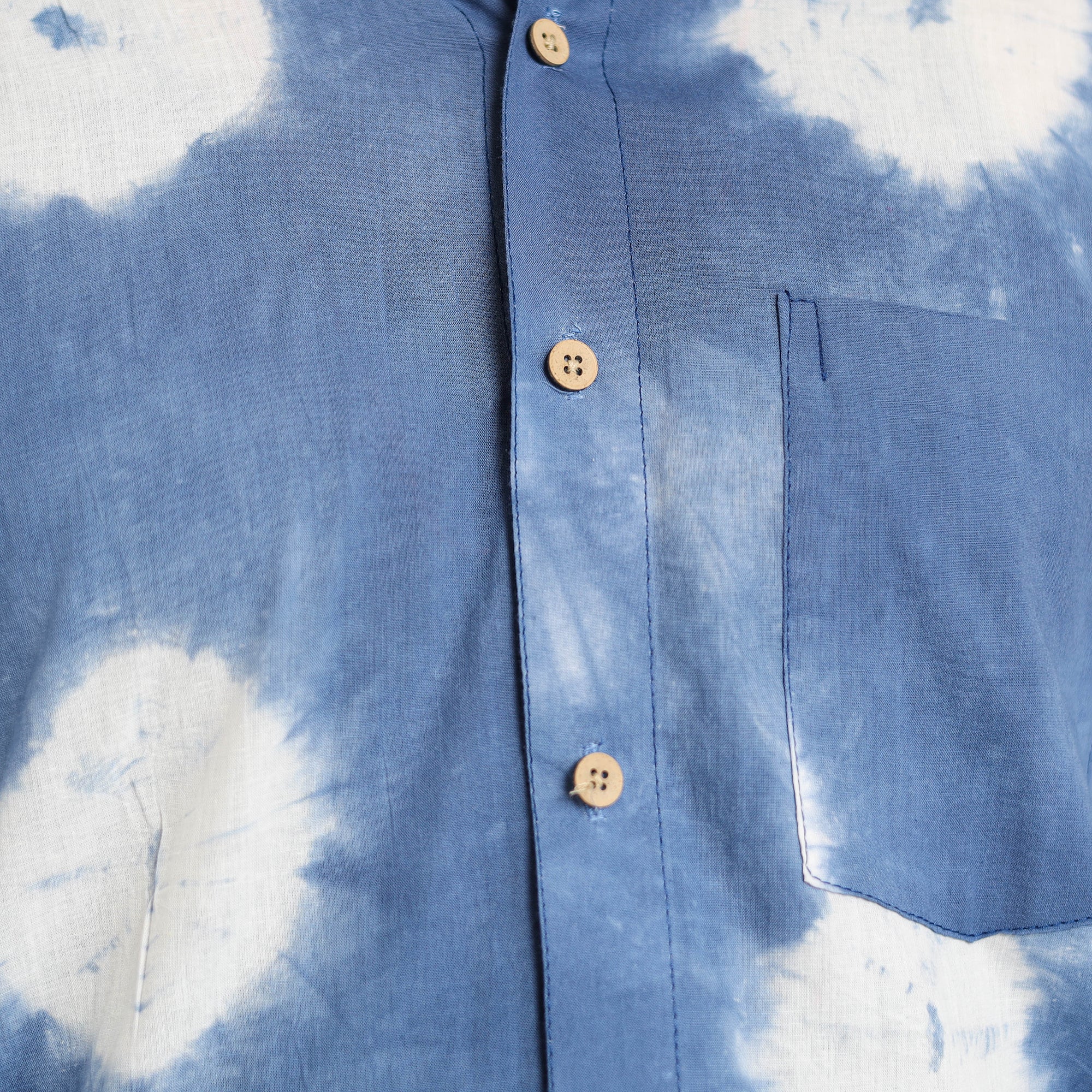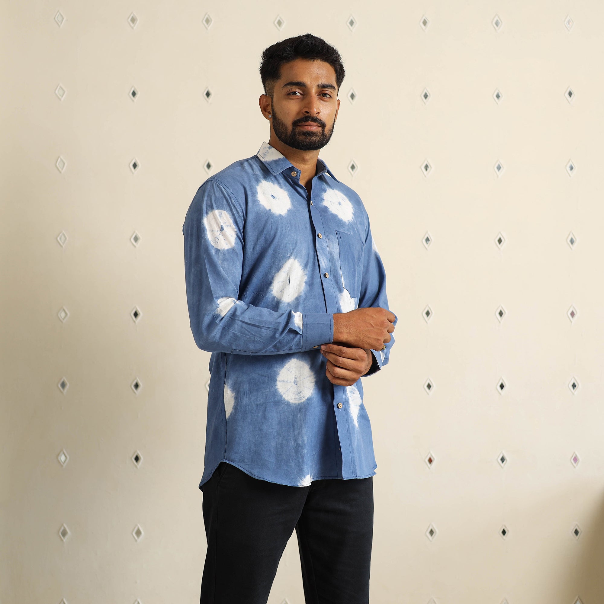 This blue full-sleeve shibori cotton men's shirt is hand-dyed using the traditional shibori technique, where the fabric is precisely folded, tied, and then dyed to create unique patterns. Made from soft, breathable cotton, it features full sleeves, a patch pocket, and wooden buttons that add a rustic touch. A perfect choice for relaxed weekends, casual outings, or everyday wear.