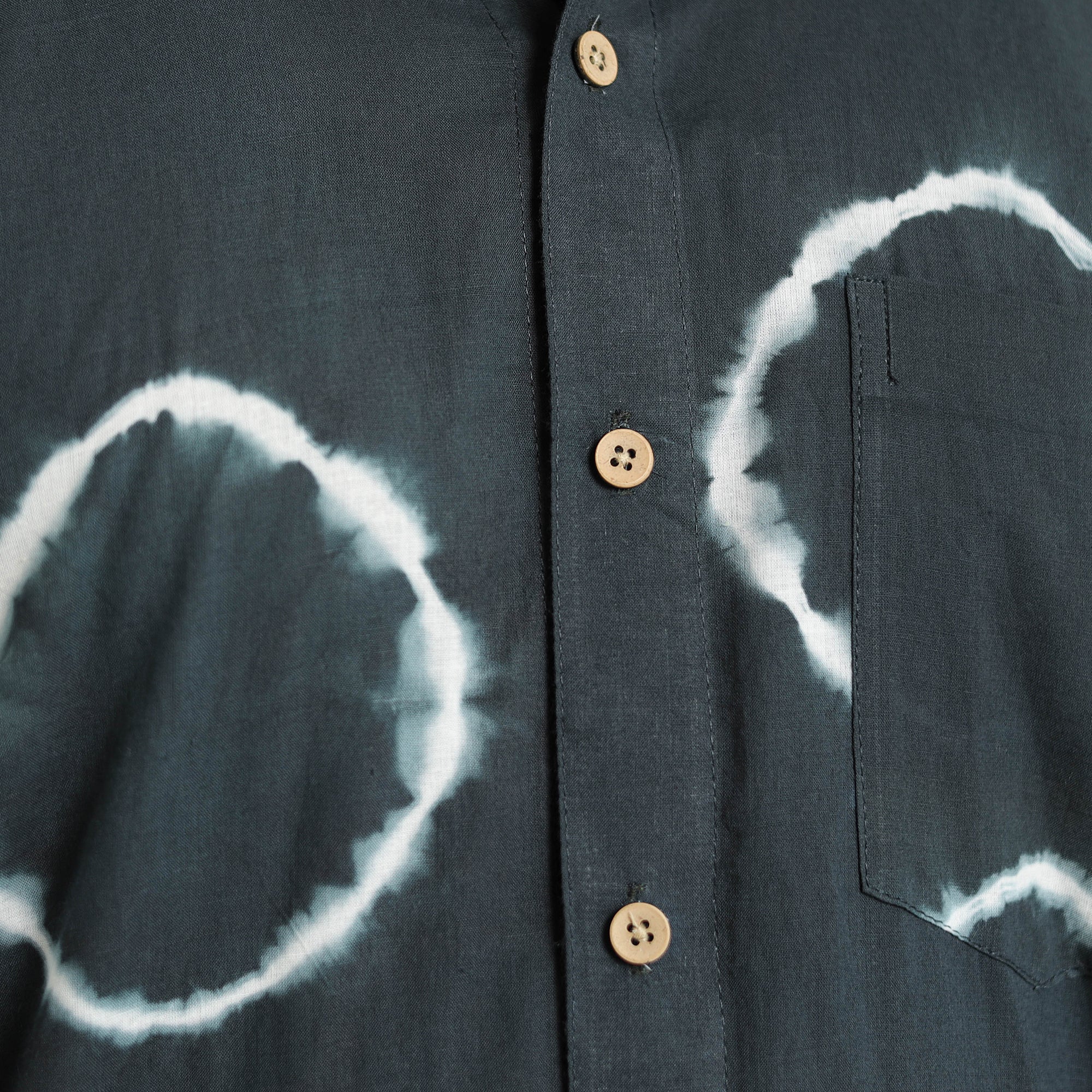 This black full-sleeve shibori cotton men's shirt is hand-dyed using the traditional shibori technique, where the fabric is precisely folded, tied, and then dyed to create unique patterns. Made from soft, breathable cotton, it features full sleeves, a patch pocket, and wooden buttons that add a rustic touch. A perfect choice for relaxed weekends, casual outings, or everyday wear.