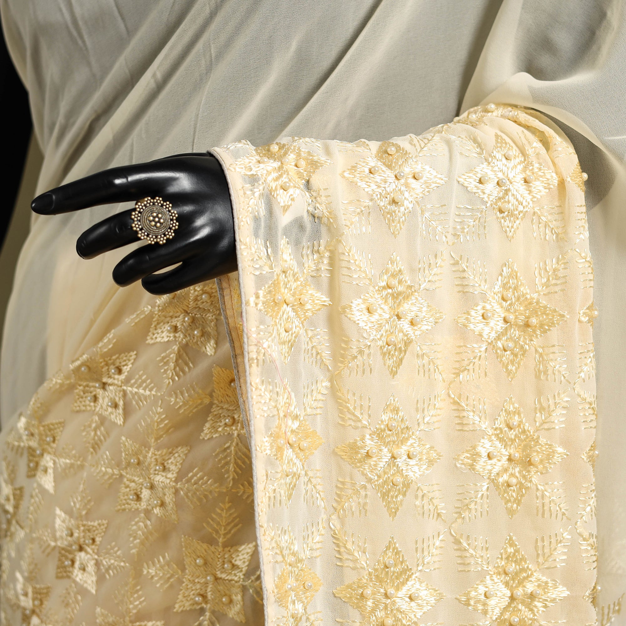 Celebrate punjabi elegance with this stunning beige phulkari georgette saree. Showcasing vivid threadwork and traditional floral designs, this saree tells the story of phulkari, where 'Phul' stands for flower and 'Kari' for craft. Ideal for festivals, ceremonies, or adding ethnic charm to your wardrobe.