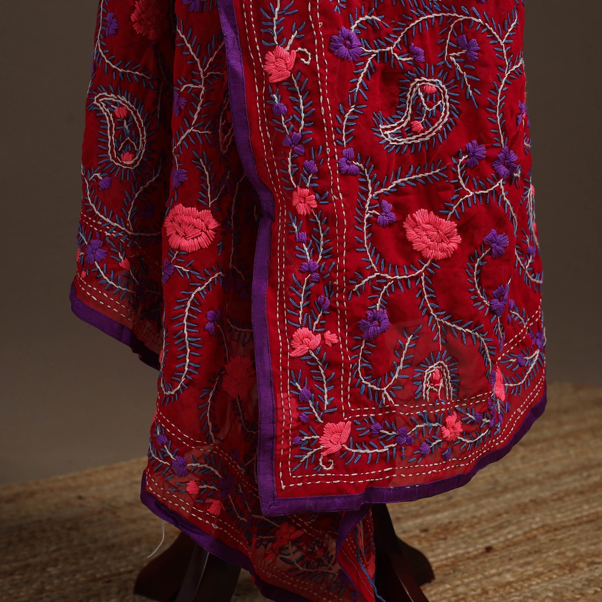 Fine quality red georgette hand-embroidered phulkari dupatta. Phulkari is a refined embroidery tradition from the Punjab region. The word phul means flower and kari means craft together, Phulkari represents the art of creating intricate floral and geometric patterns using colorful threads. A unique variation of Phulkari is Bagh work, which literally means "garden" and features embroidery that covers the fabric entirely. Lightweight and graceful, this dupatta is perfect for festive occasions, weddings and cultural celebrations.