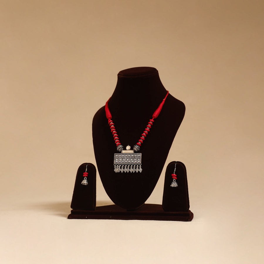 Add a touch of handmade charm to your look with this german silver necklace set adorned with red bead work. Known for its antique finish and durability, German silver gives the set a refined touch. It comes with matching earrings for a complete look. Created by skilled artisans, this set is perfect for festive occasions, cultural functions or simply adding a unique flair to your everyday style.