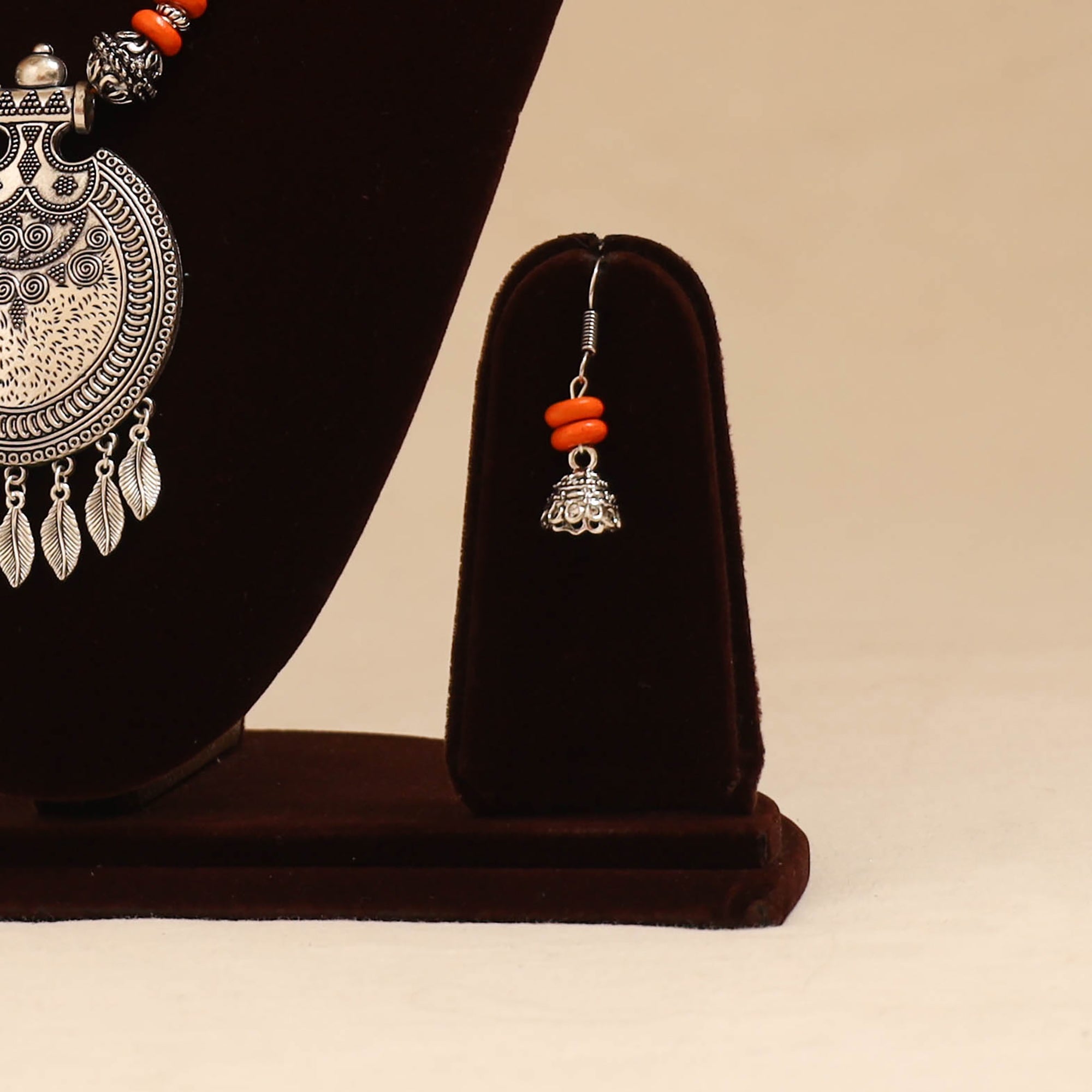 Add a touch of handmade charm to your look with this german silver necklace set adorned with orange bead work. Known for its antique finish and durability, German silver gives the set a refined touch. It comes with matching earrings for a complete look. Created by skilled artisans, this set is perfect for festive occasions, cultural functions or simply adding a unique flair to your everyday style.