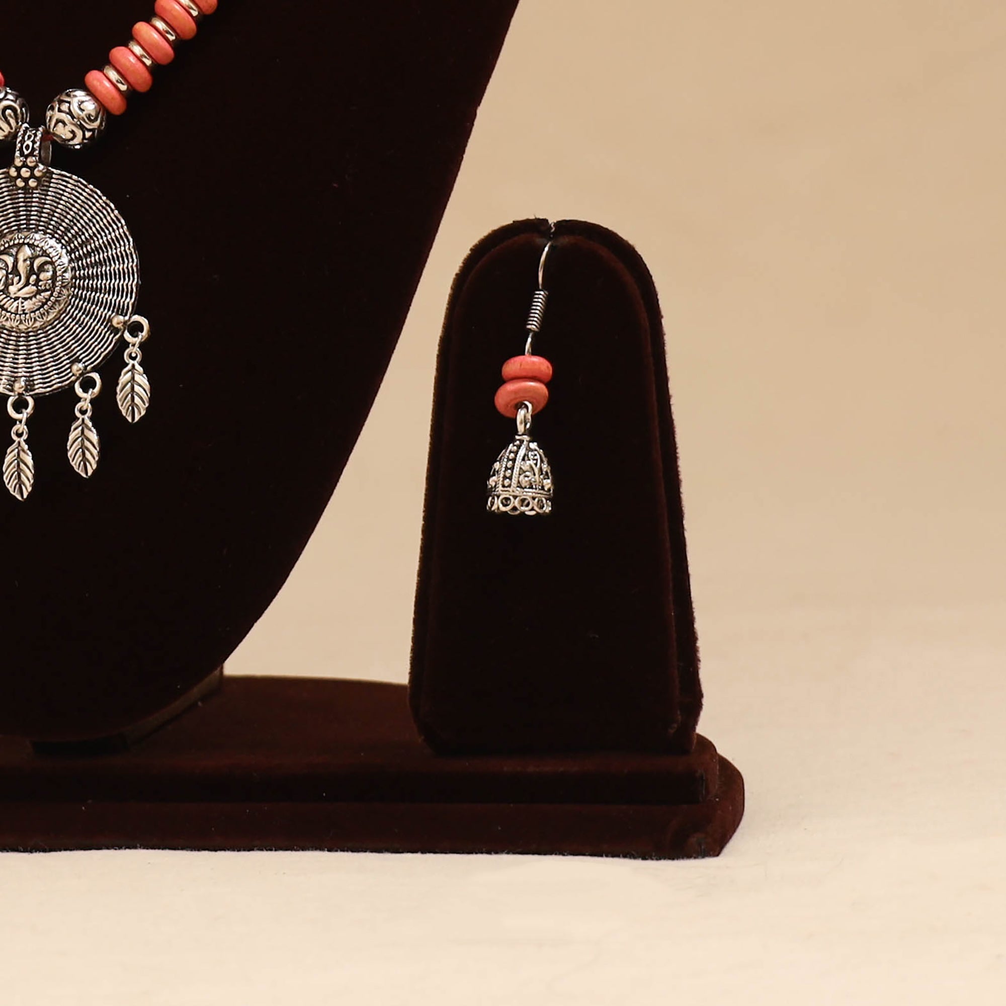 Add a touch of handmade charm to your look with this german silver necklace set adorned with bead work. Known for its antique finish and durability, German silver gives the set a refined touch. It comes with matching earrings for a complete look. Created by skilled artisans, this set is perfect for festive occasions, cultural functions or simply adding a unique flair to your everyday style.