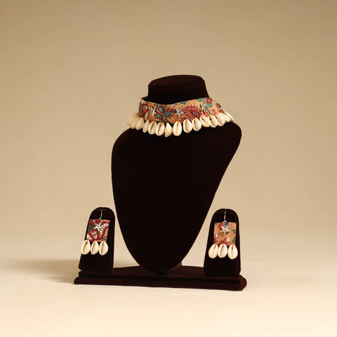 Enhance your style with this peach choker necklace set, featuring a handcrafted fabric base adorned with german silver accents and matching earrings. Perfect for both ethnic and modern outfits, the shell detailing adds a touch of rustic charm, making it a true statement accessory.