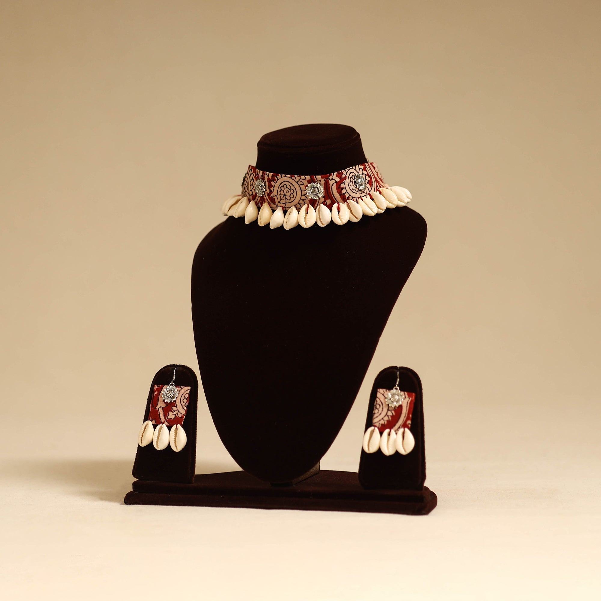 Enhance your style with this red choker necklace set, featuring a handcrafted fabric base adorned with german silver accents and matching earrings. Perfect for both ethnic and modern outfits, the shell detailing adds a touch of rustic charm, making it a true statement accessory.
