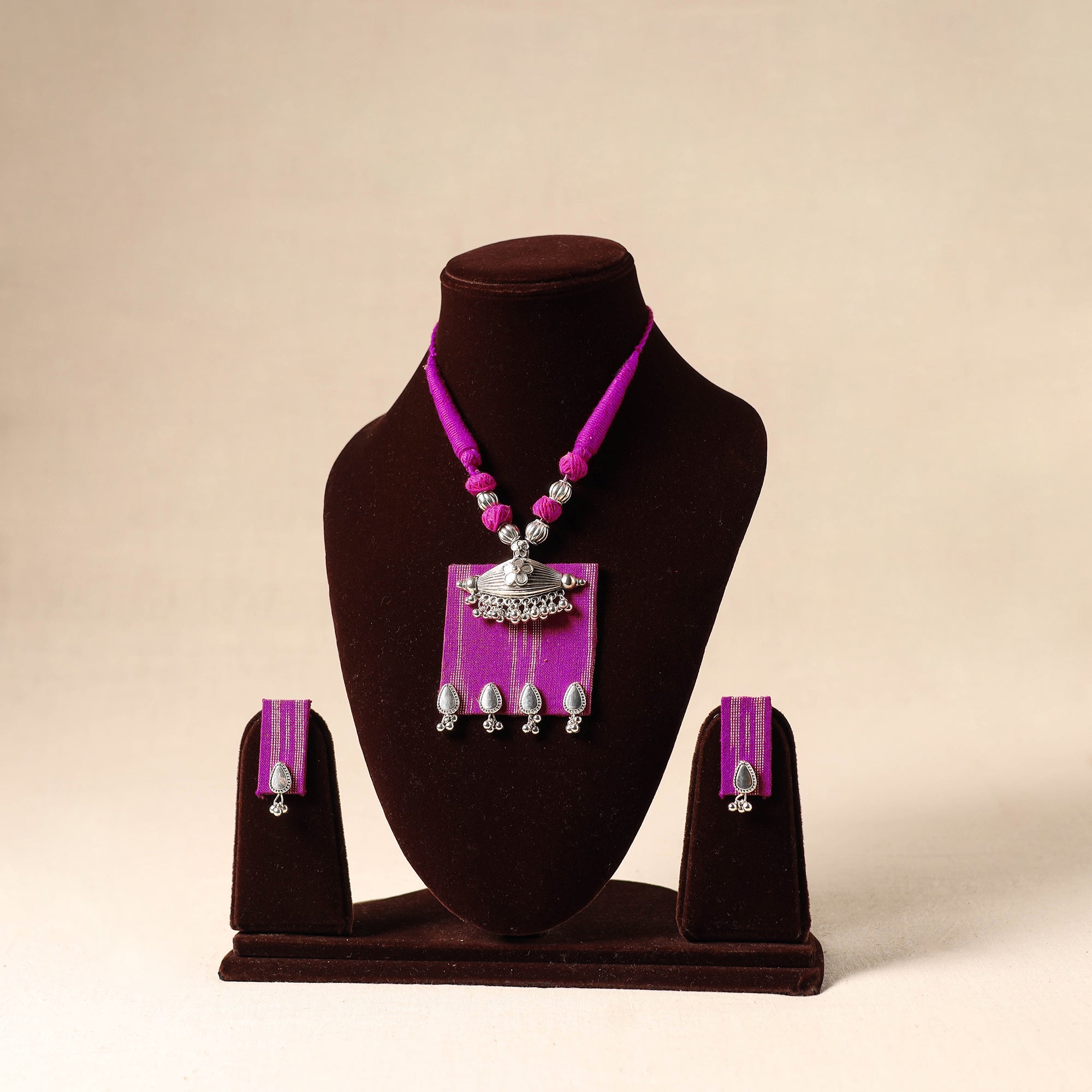Add a touch of handmade charm with this purple necklace set, crafted from thread and adorned with a fabric pendant accented in german silver. It comes with matching earrings to complete your look. Lightweight and artisan-made, it pairs effortlessly with traditional outfits. Ideal for festive gatherings, cultural functions, or simply to bring a unique touch to your everyday style.